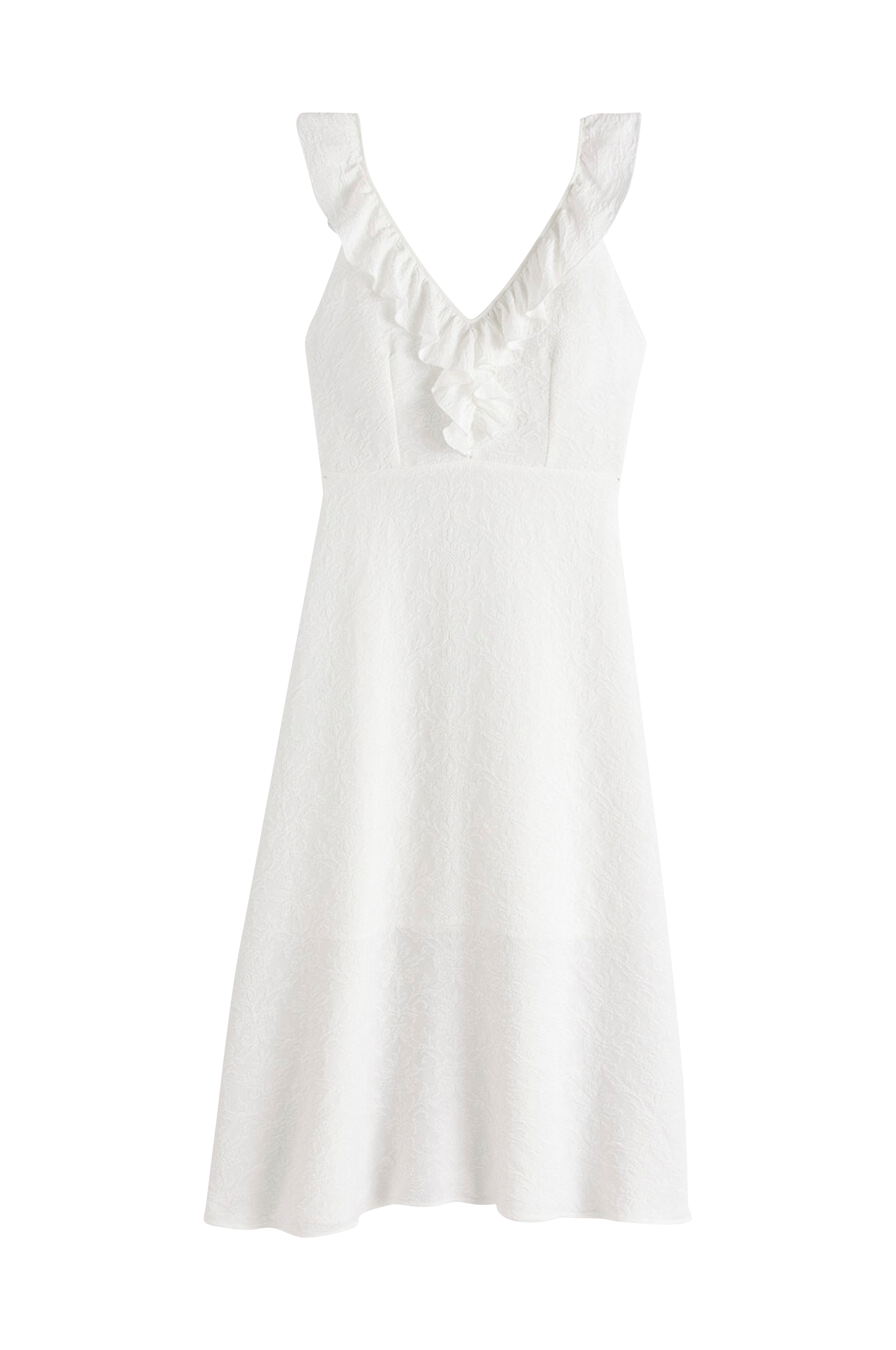 Mekko, jossa röyhelö v-pääntiessä ja syvä pääntie takana. Yksityiskohdat