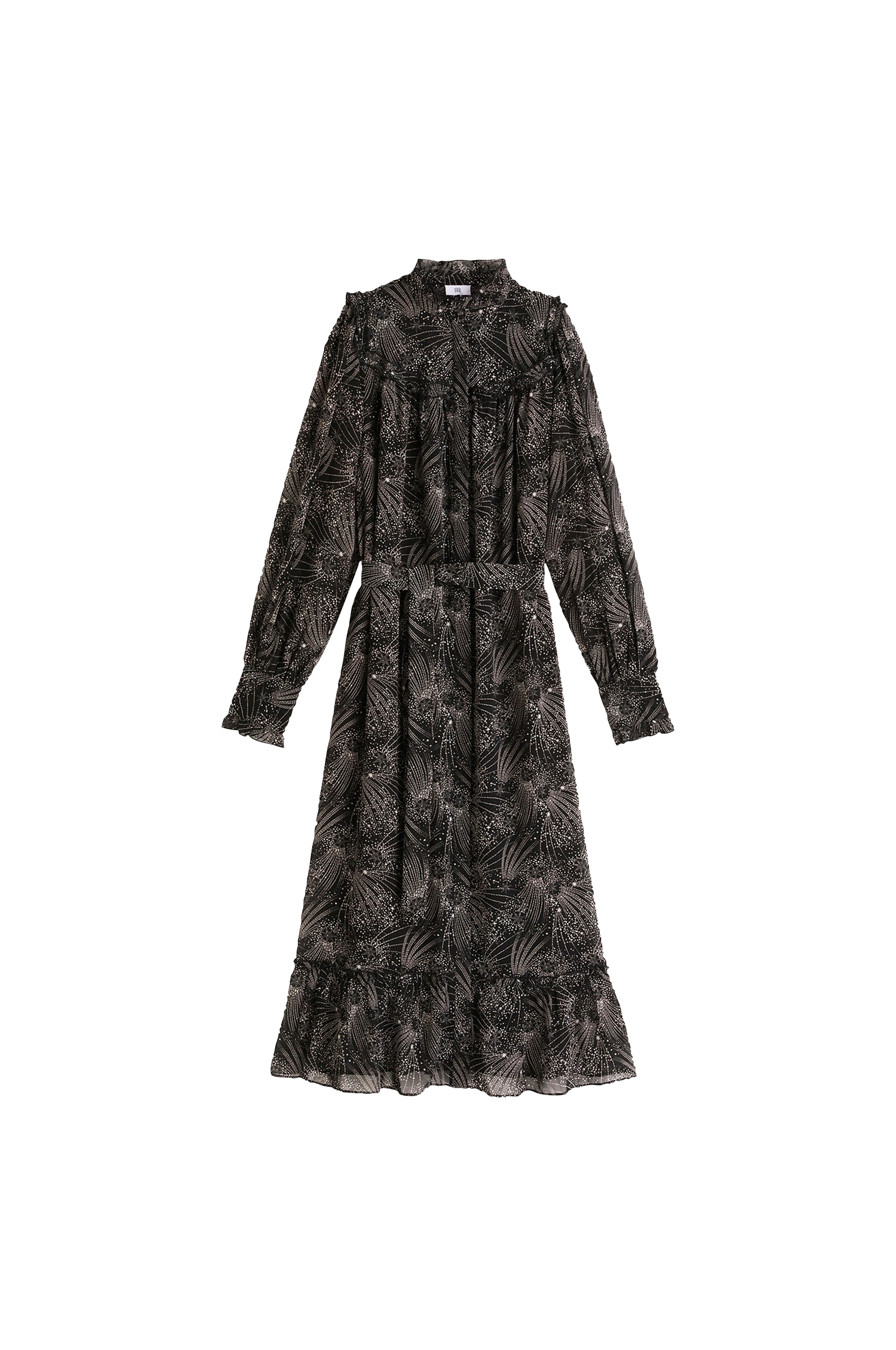 Päivitetty retrohenkinen pitkä mekko, jossa on pieni pystykaulus, puhvihihat ja röyhelö helmassa. Vintagehenkinen, boheemityylinen kuvio.