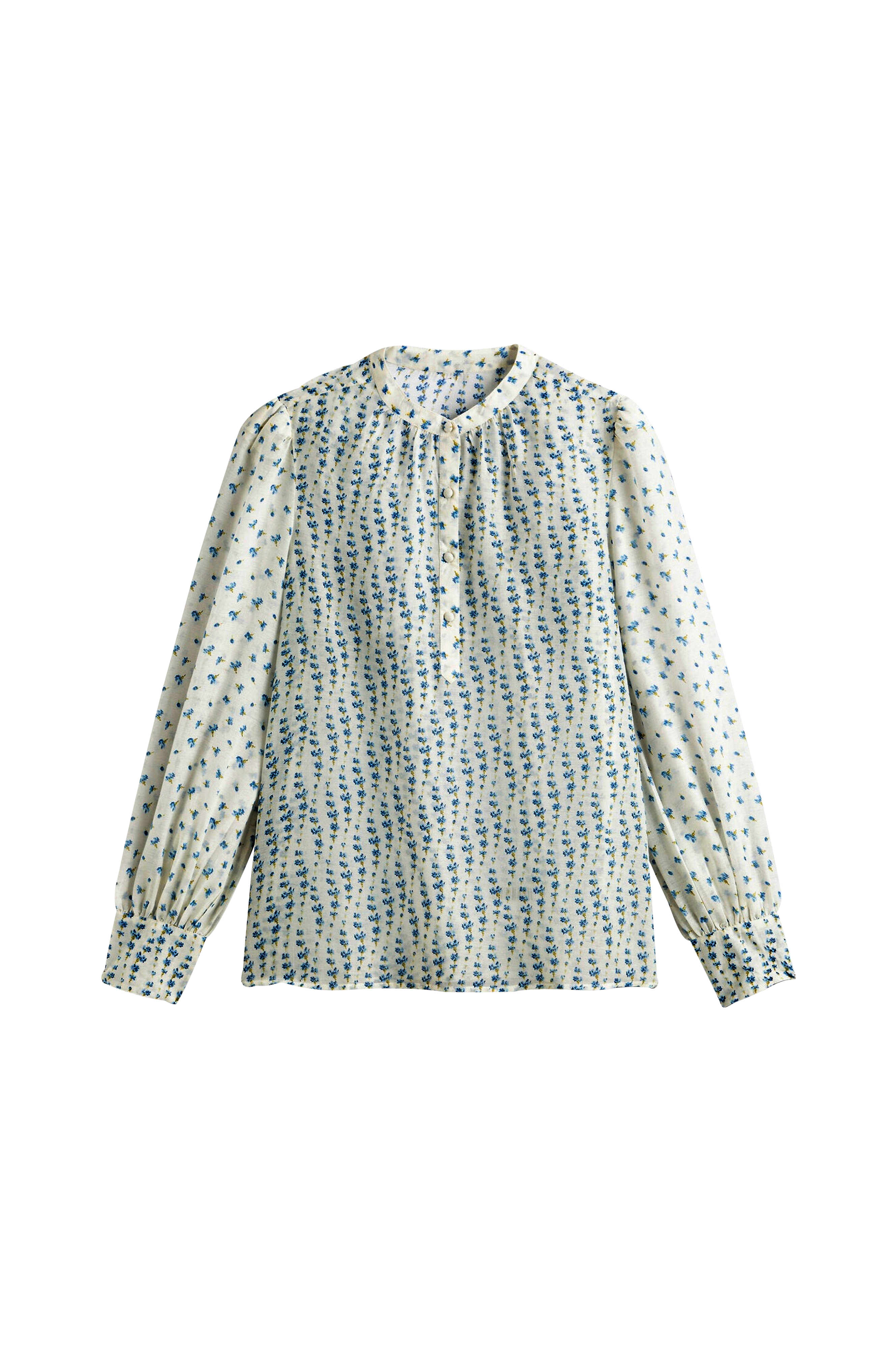 Tyylikäs pusero, jossa pienikukallinen kuvio. Romanttinen malli, jossa trendikkäät puhvihihat. Yksityiskohdat - Pitkät puhvihihat - Suora malli - Pieni pystykaulus - Puolipitkä napitus edessä - Painettu kukkakuvio - Pituus 65 cm koossa 38 Materiaali ja hoito-ohje - 100% polyesteriä - Hienopesu 30° - Silitys matalalla lämmöllä/ei valkaisuainetta - Ei rumpukuivausta - Ei kemiallista pesua