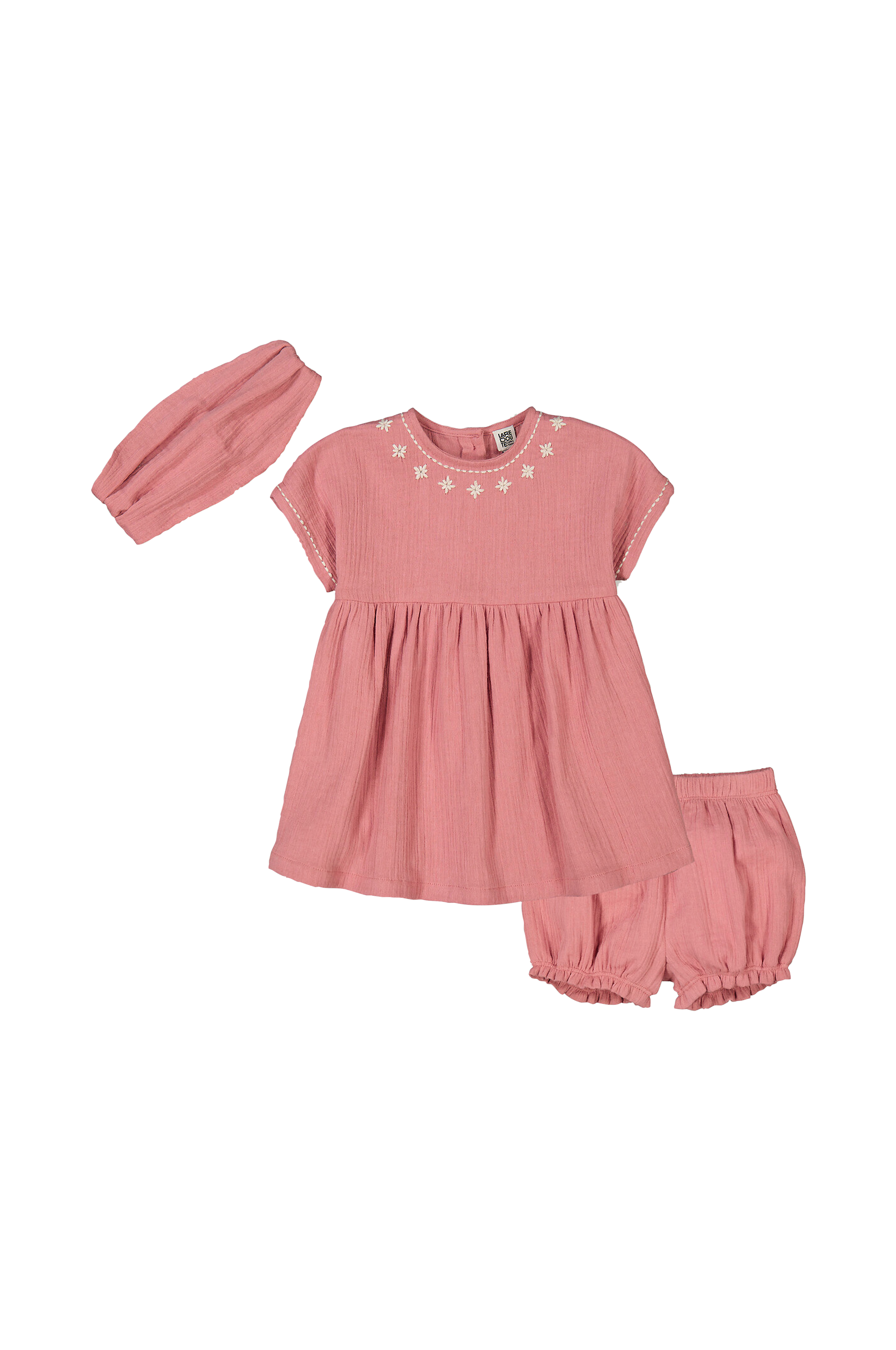 3-osainen puuvillainen musliiniasu juhlatilaisuuteen, jossa on lyhythihainen pusero, pikkuhousut ja hiuspanta. Täydellinen vastasyntyneen lahjaidea.