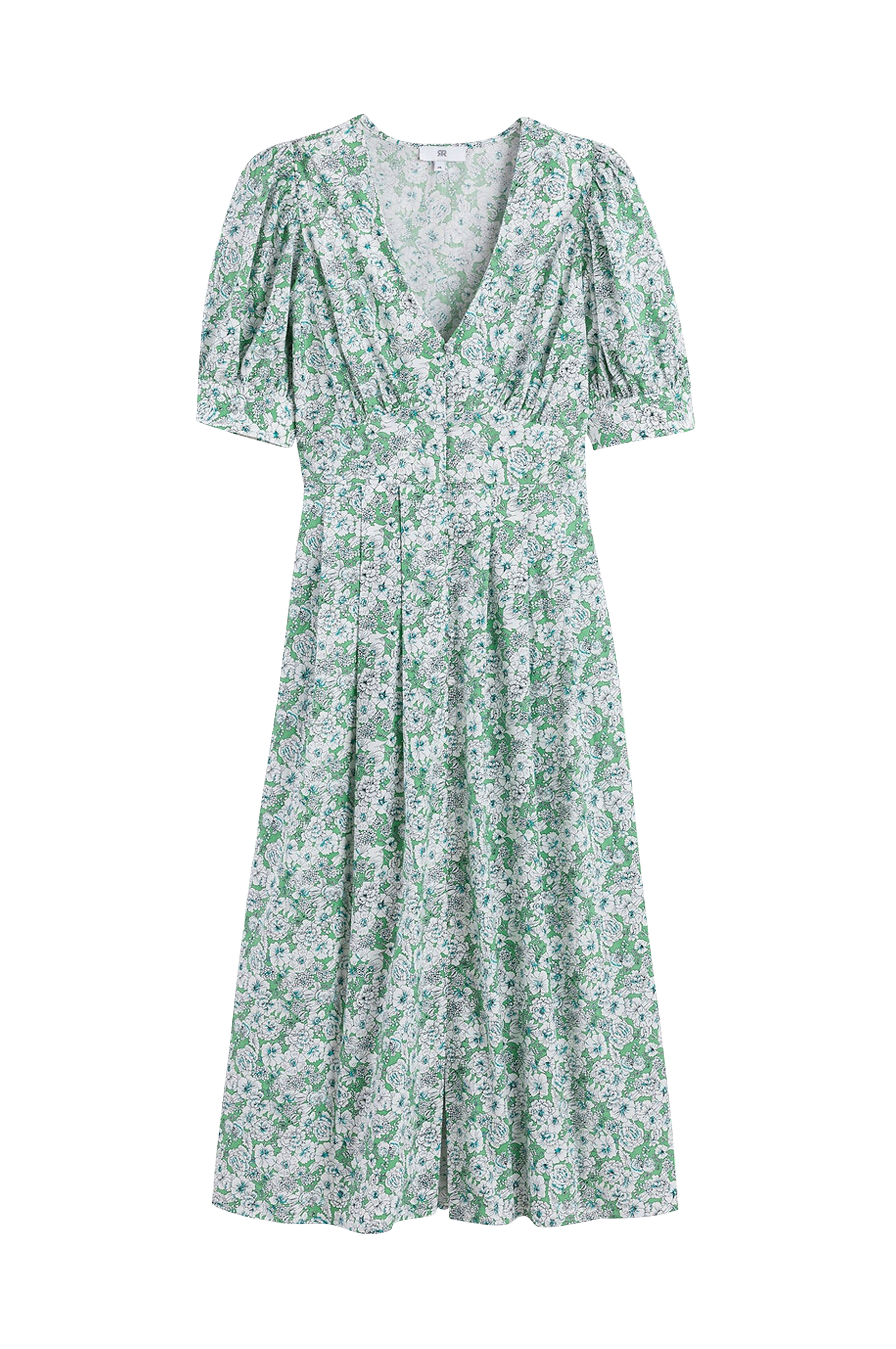 Kukallinen pitkä mekko. Vartalolle edullinen leikkaus, jossa korostettu vyötärö. Kauniit päällystetyt napit. Yksityiskohdat