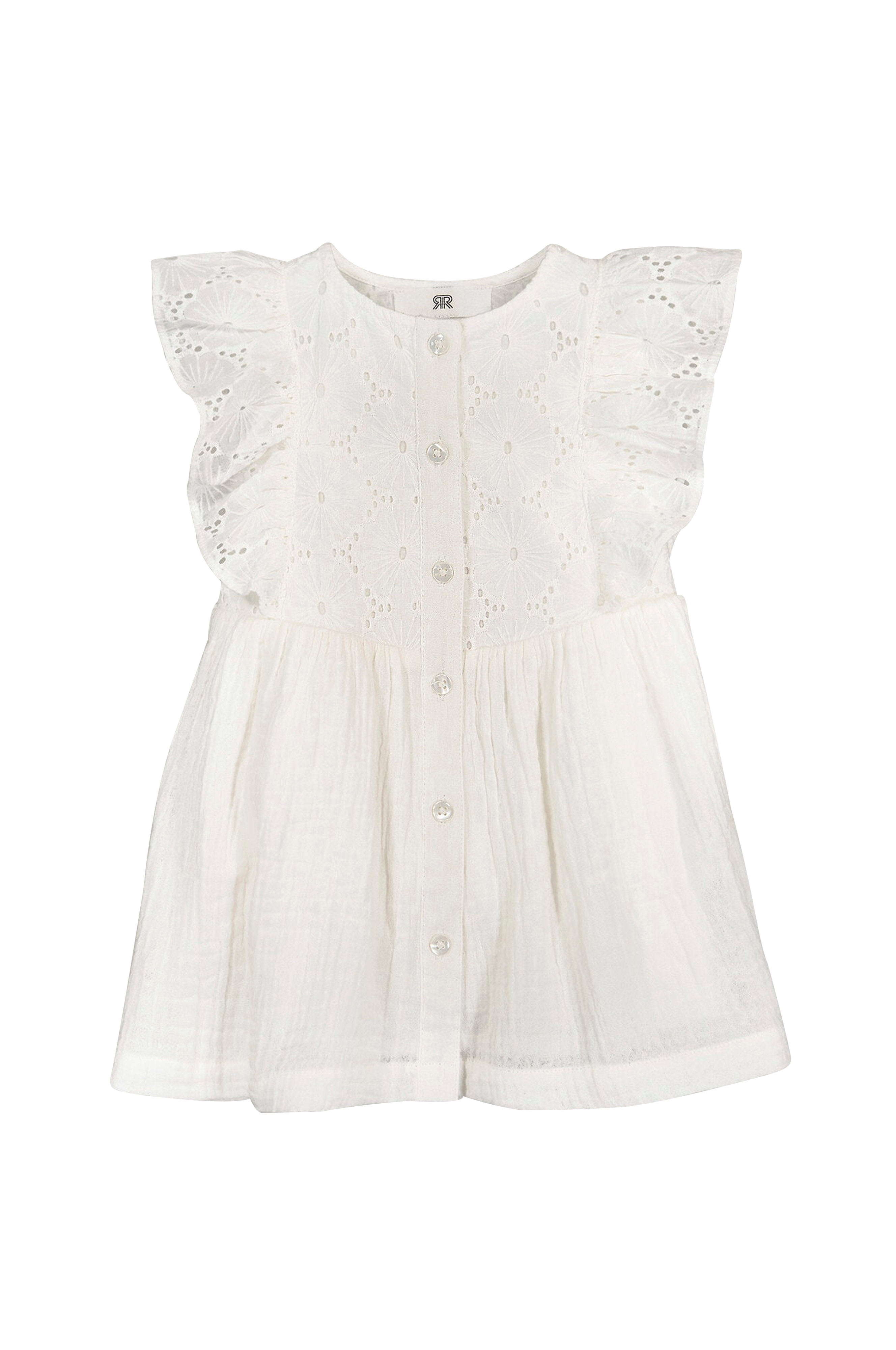 - Edessä ja takana päälleommellut röyhelöt, joissa reikäkirjailuja