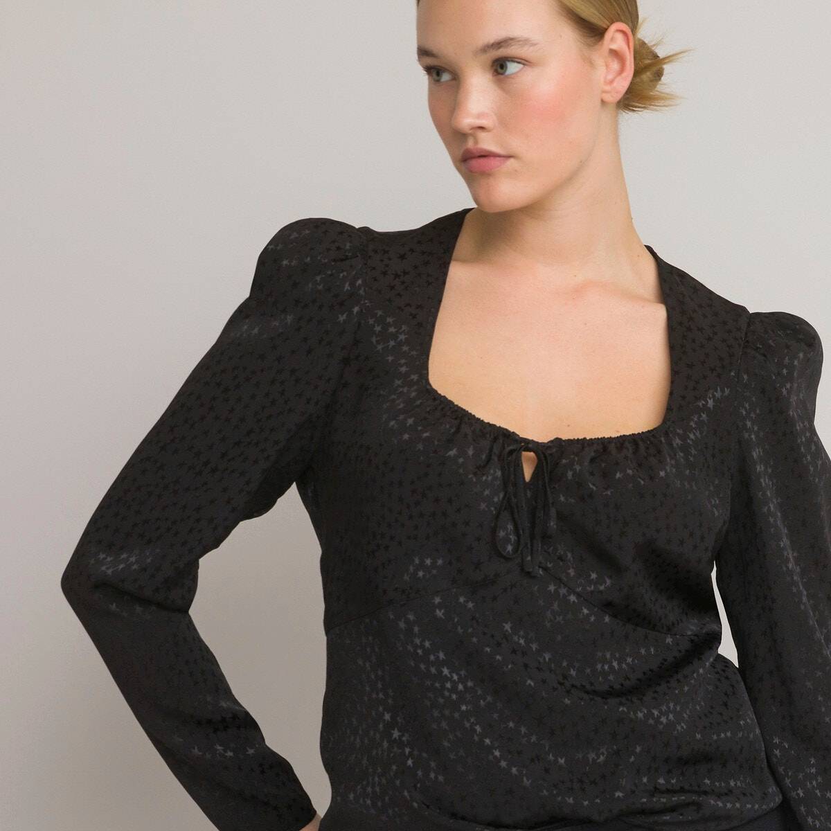 Paita, jossa sydämenmuotoinen pääntie. Kankaassa on sointuvansävyinen tähtikuvio. Yksityiskohdat
