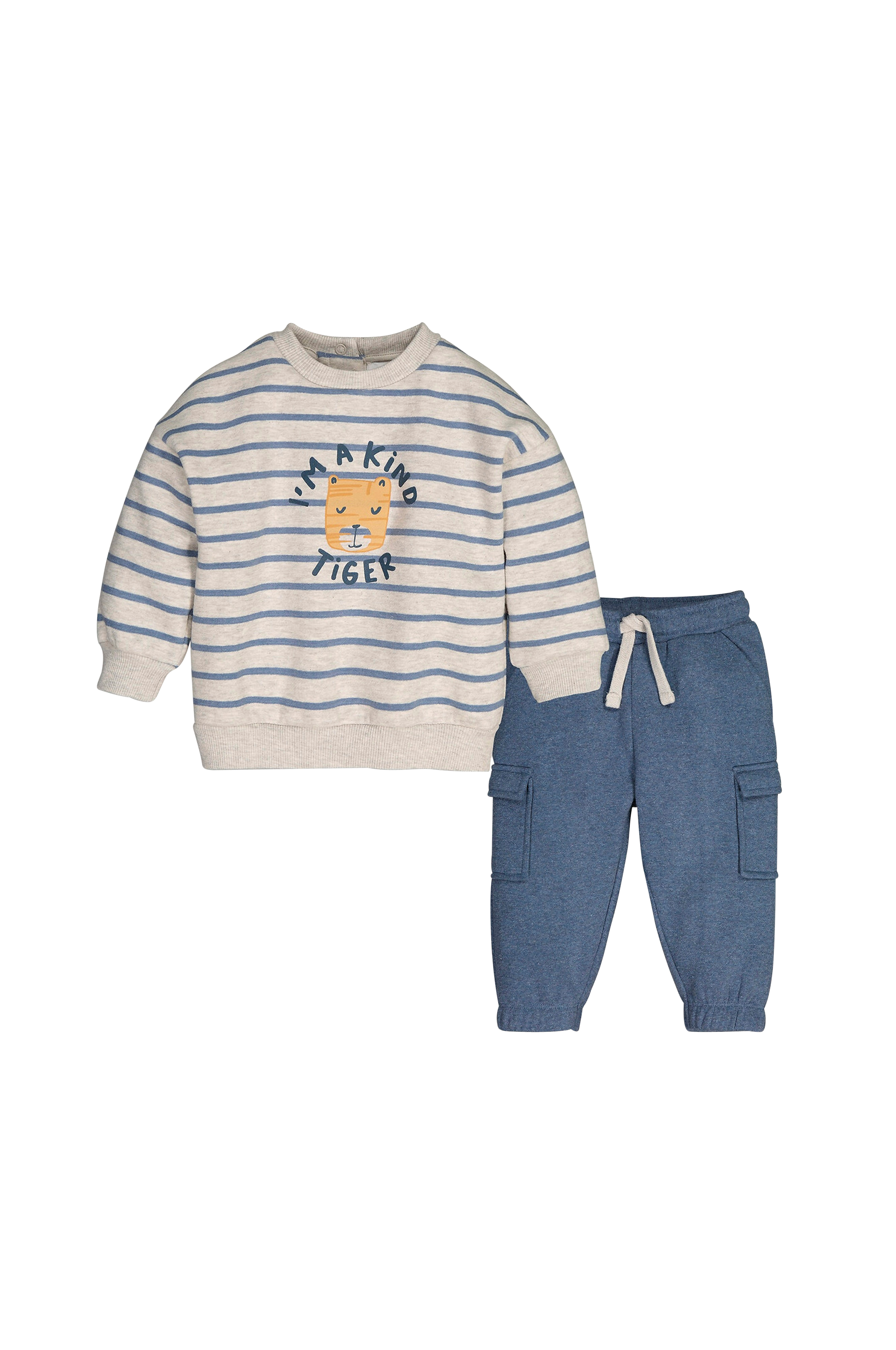 Setti lämmintä ja pehmeää collegemateriaalia. Raidallinen pusero, jossa pyöreä pääntie, ja yksiväriset housut.