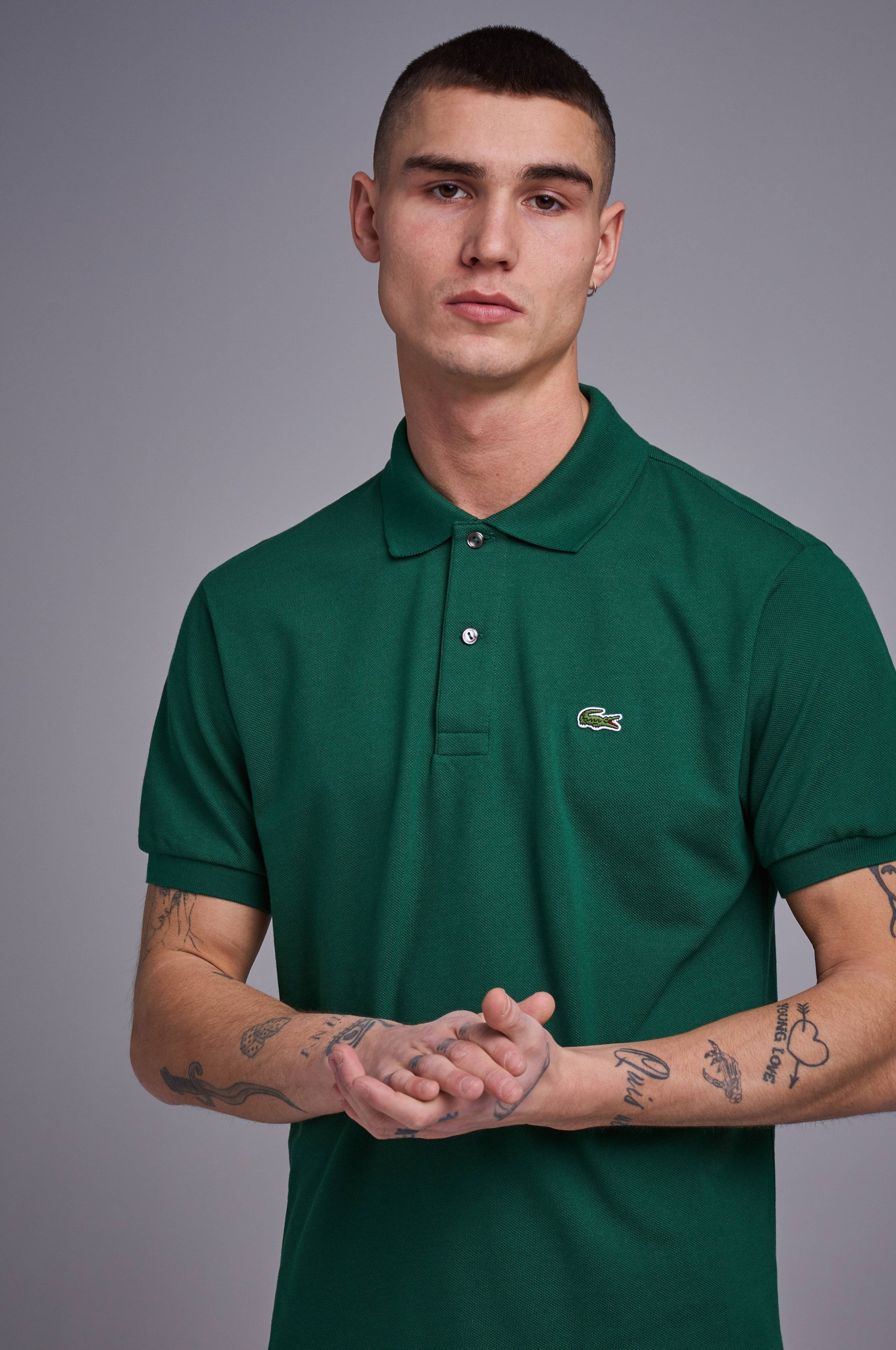 Lacosten klassinen pikeepaita, jossa lyhyet hihat ja napit ylhäällä edessä.