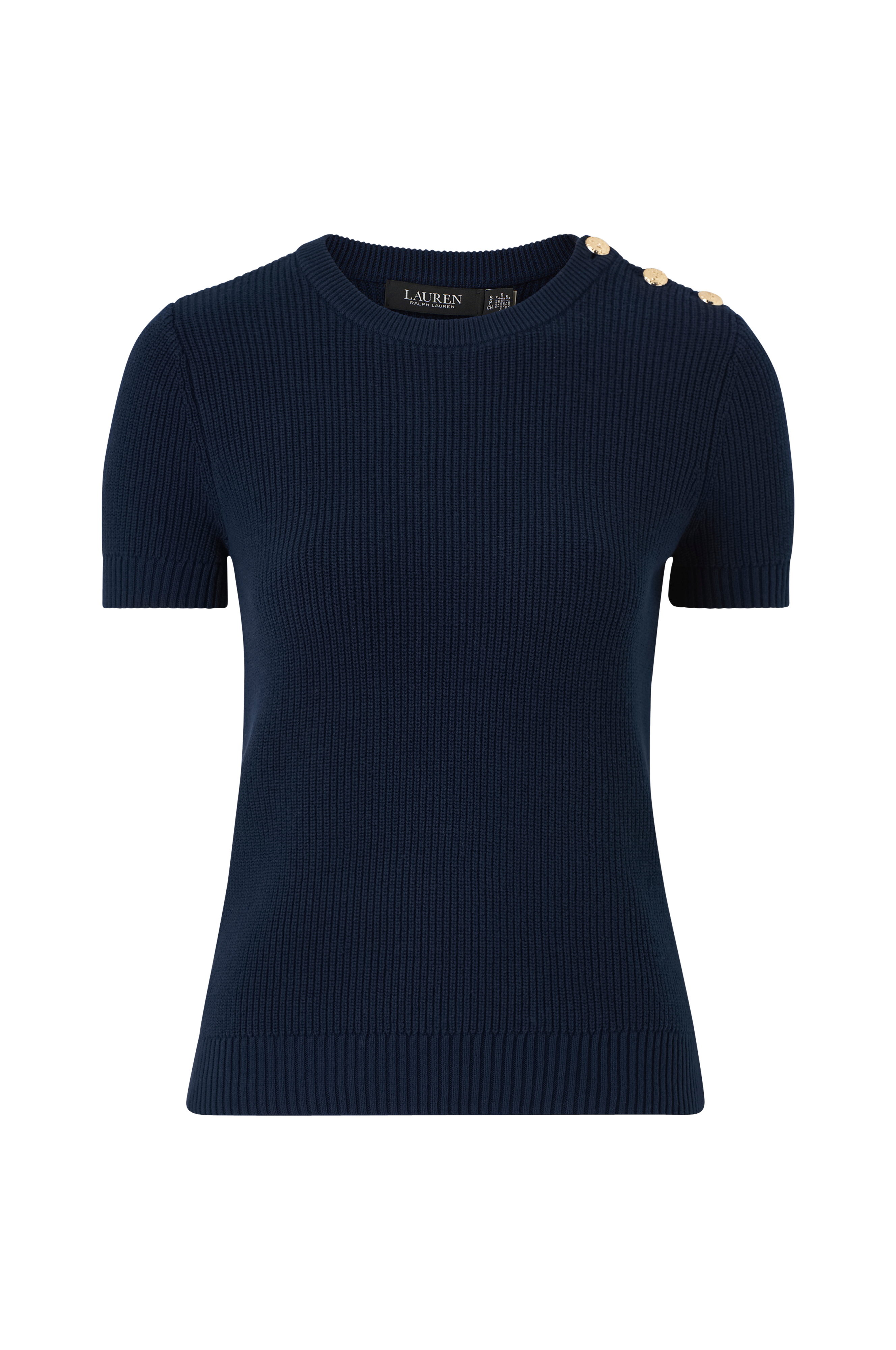 • Neulottu paita puuvillasta• Veneen muotoinen kaula-aukko• Kullanväriset, hohtavat metallinapit toisessa olkapäässä• Ribbineulos hihansuissa ja alhaalla