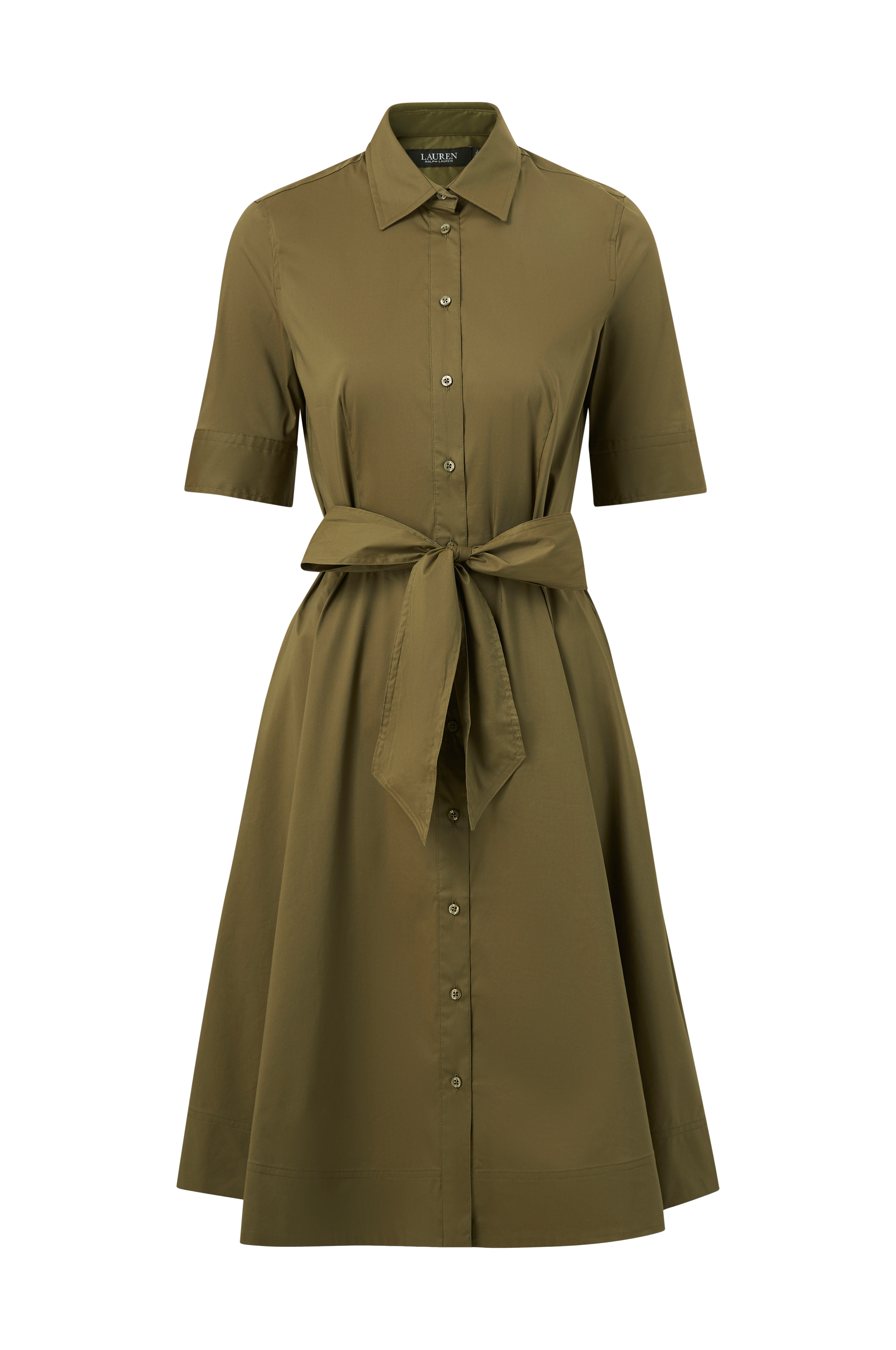 Vartalonmyötäinen malli, jossa poikkileikkaus ja solmimisvyö vyötäröllä. Leveä hameosa ja upotetut sivutaskut. Pieni kaulus ja kokopitkä napitus edessä. Lyhyet hihat ja hihansuissa leveä kalvosin. Pituus n. 108 cm koossa 36.