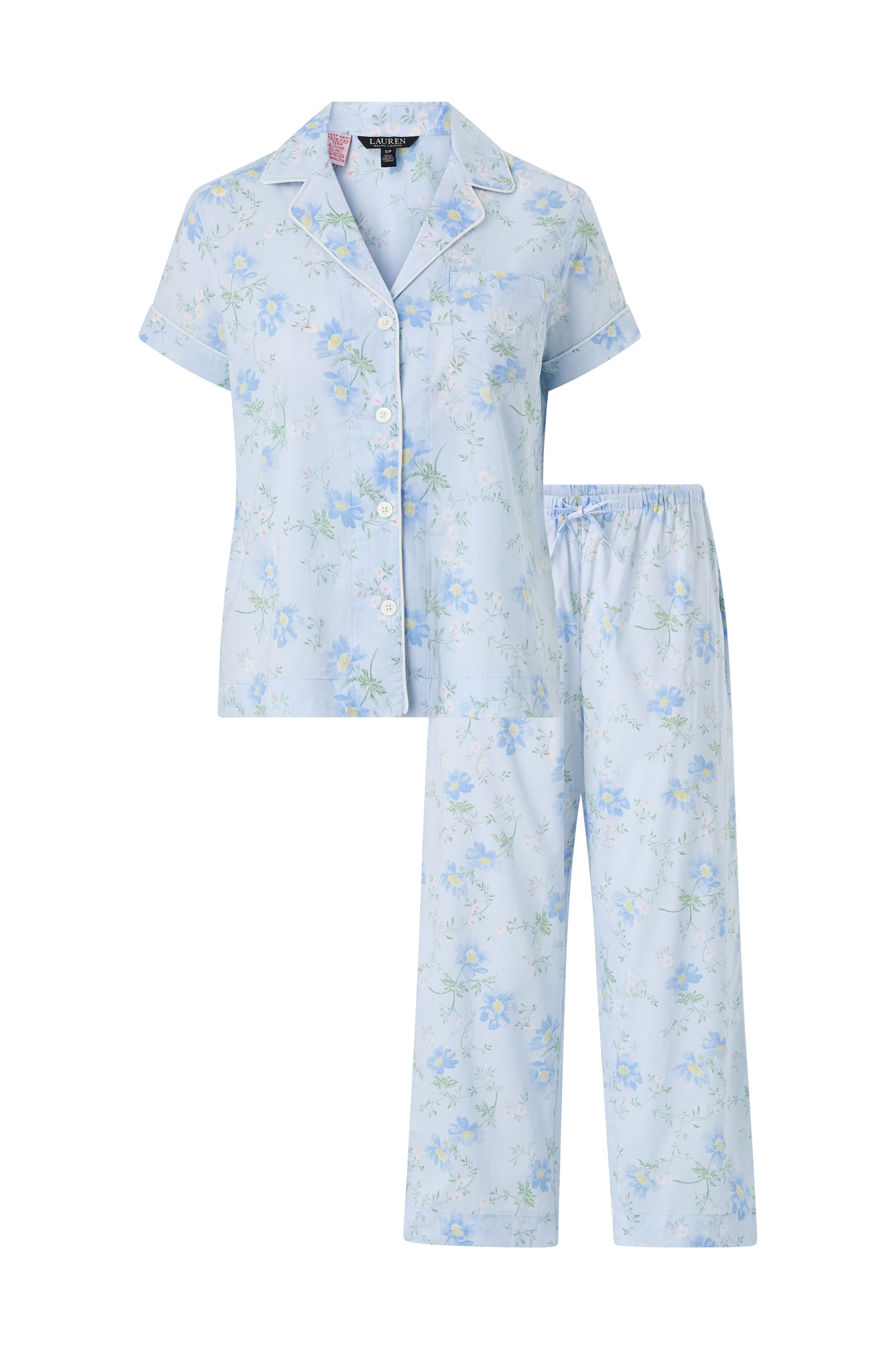 • Kaksiosainen pyjama paidalla ja housuilla• Lyhythihainen pyjamapaita rintataskulla ja halkiolla alhaalla sivuilla• Cropatut pyjamahousut kiristysnyörillä vyötäröllä