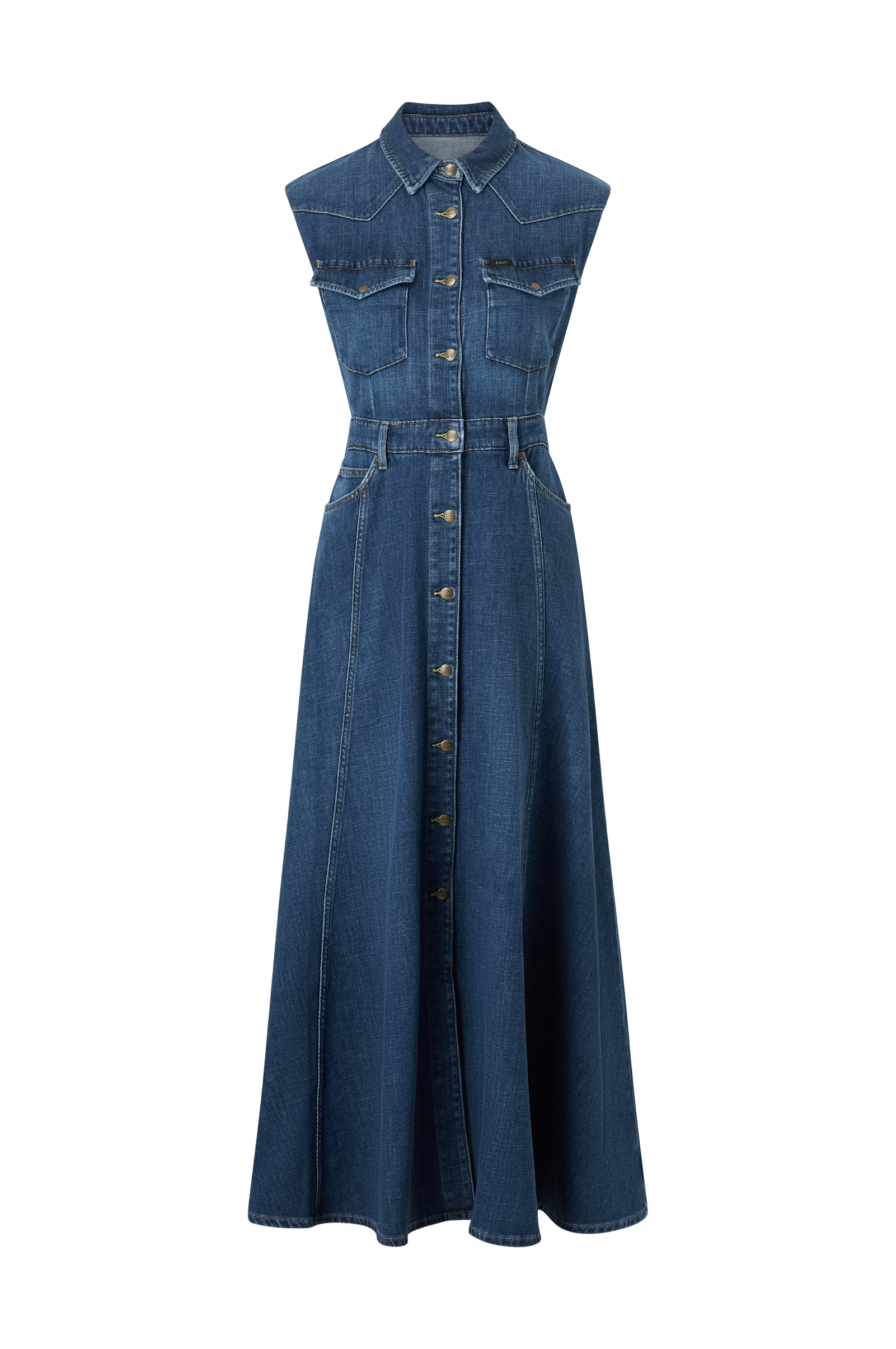 • Pitkä, hihaton farkkumekko kauluksella