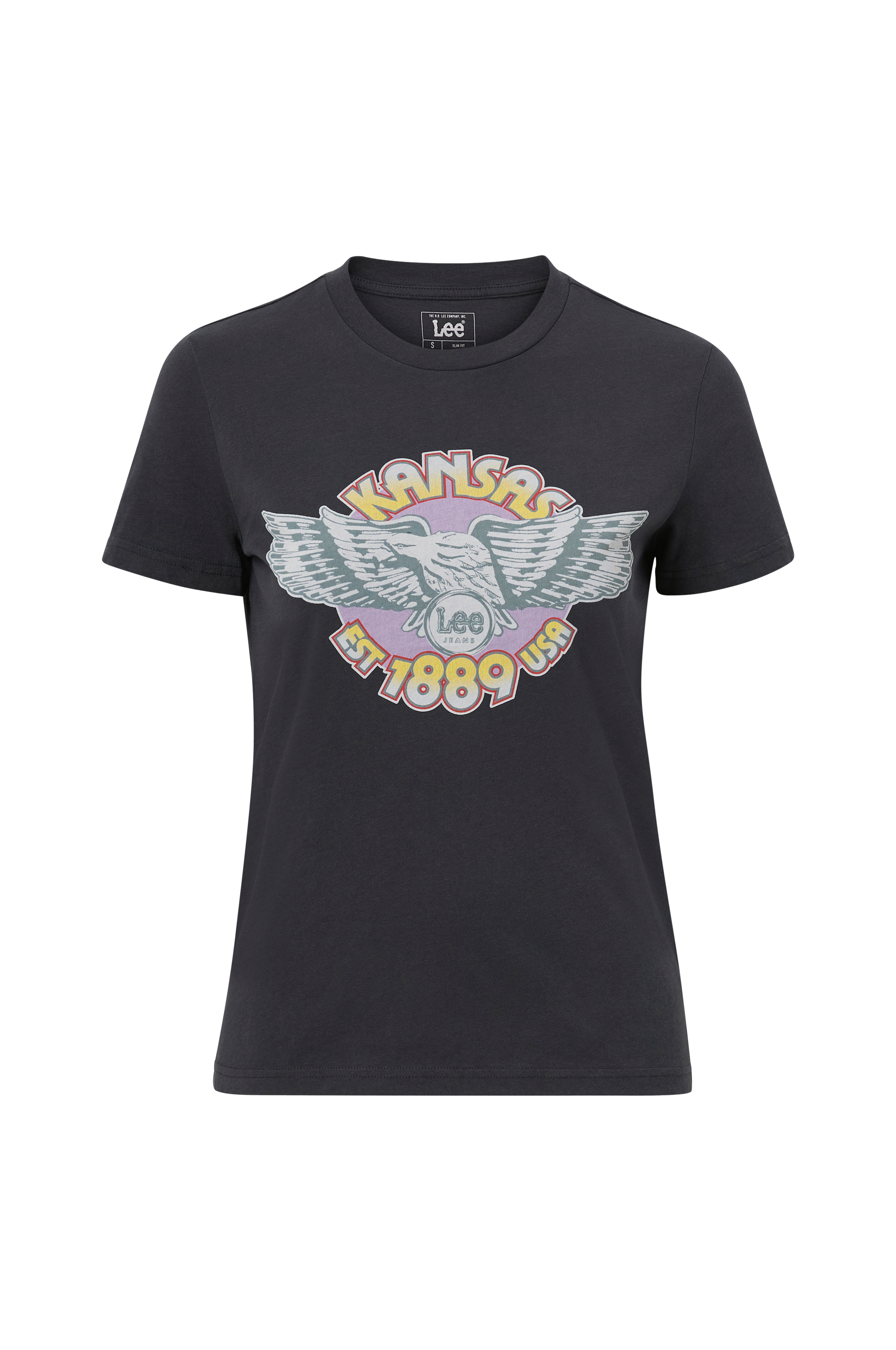 Pusero puuvillatrikoota. Painatus edessä. Kapea malli, lyhyet hihat ja pyöreä joustinneulospääntie.