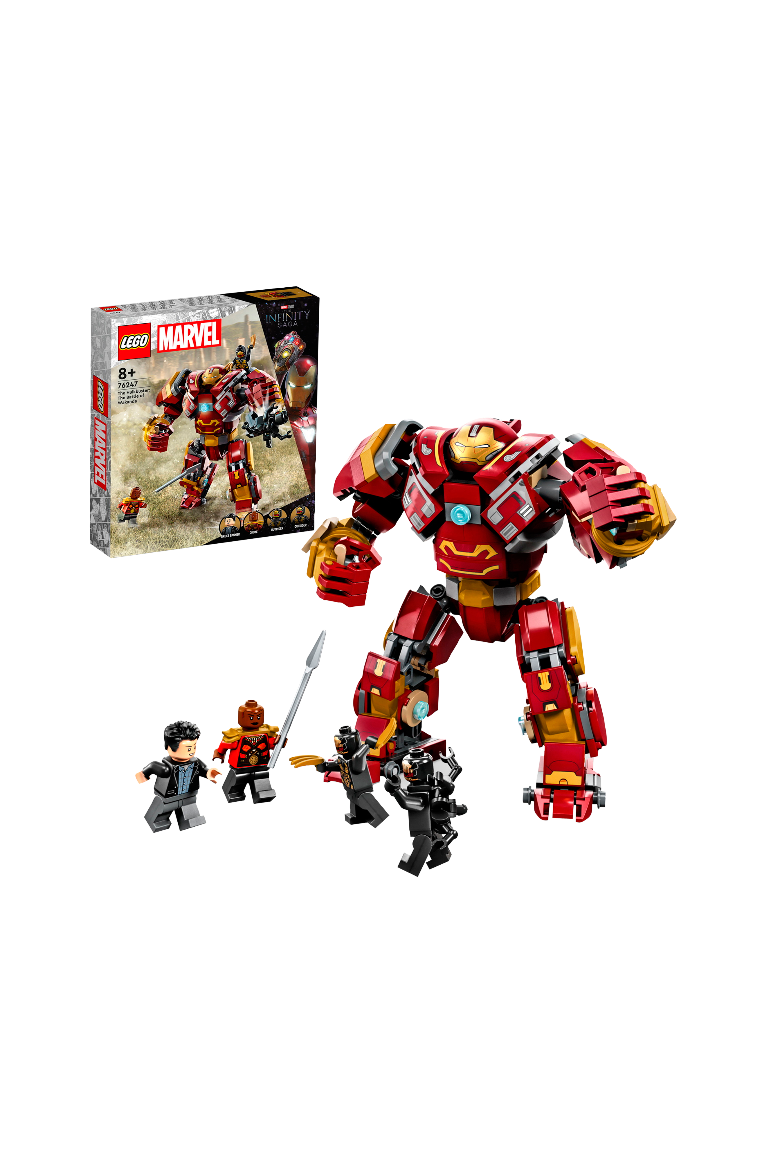 Setissä on 4 minihahmoa - Bruce Banner, Okoye ja 2 outrideria. Bruce Bannerin pää muuttuu käännettäessä vihreäksi, ja Okoyella on mukanaan keihäs.