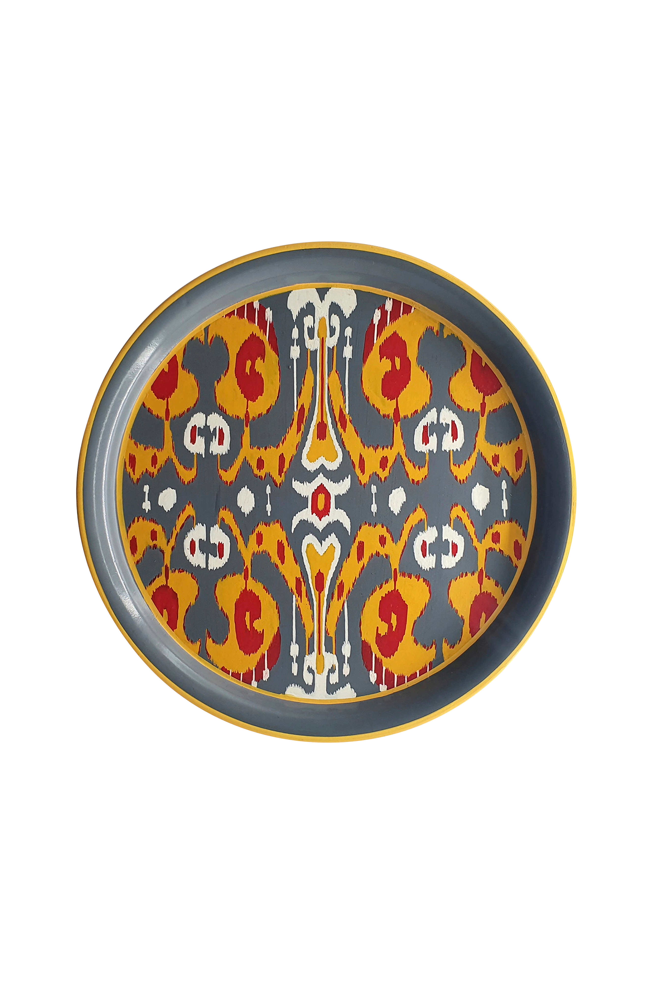 Kaunis ja värikäs rautatarjotin, jossa käsinmaalattu kuvio.