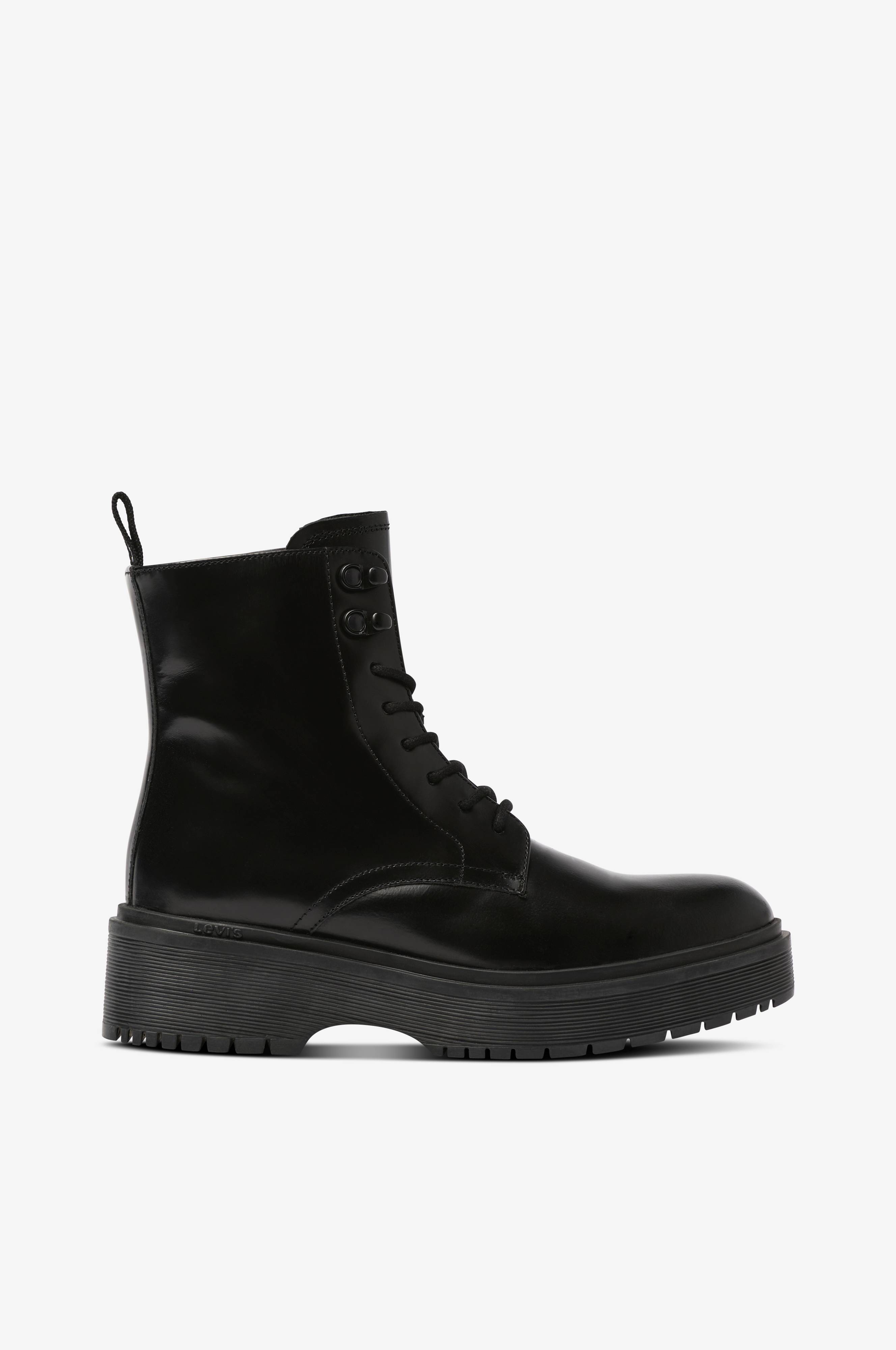 Nilkkurit kiiltävää sileää nahkaa. Kankainen vetolenkki takana. Edessä nyöritys, jossa mononyöritys ylhäällä. Vuori nahkaa ja kangasta. Korkea ulkopohja kumia. Pohjan korkeus 3 cm, koron korkeus n. 5 cm. Varren korkeus 13 cm koossa 37.