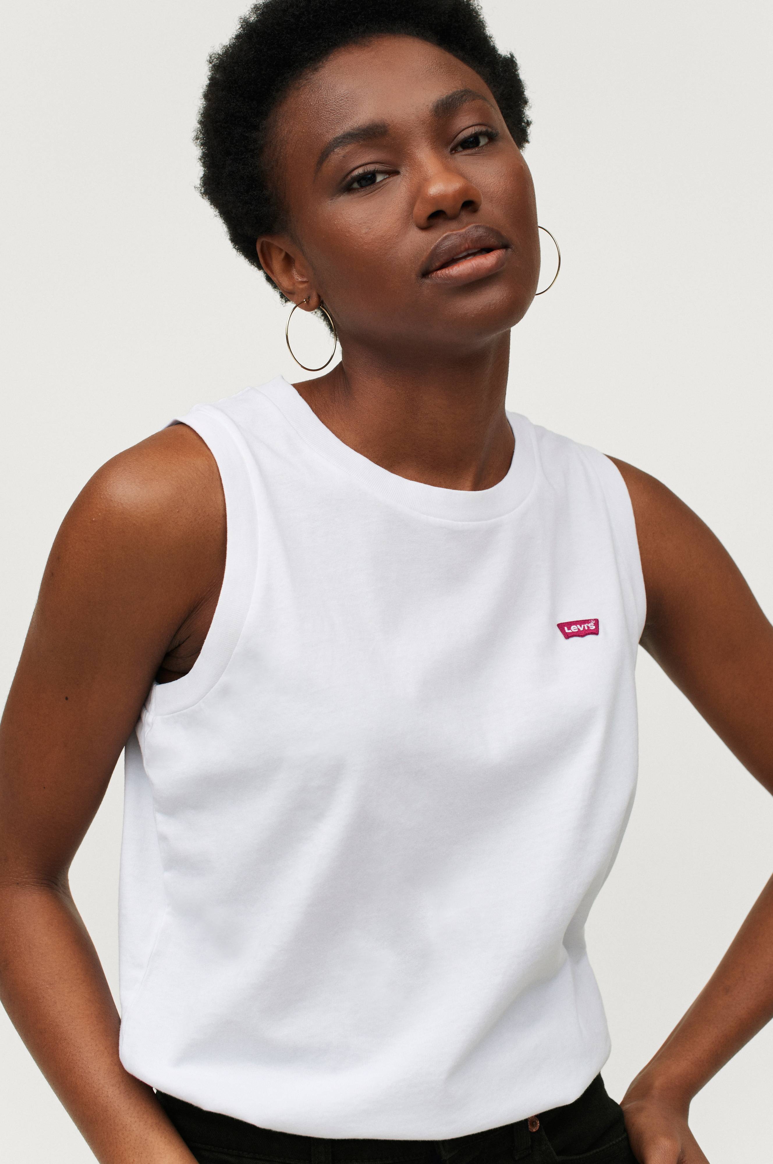 Puuvillatoppi, jossa reunat joustinneulosta pääntiessä ja kädenteissä. Sivuhalkiot helmassa. Kirjailtu Levi's-logo rinnassa.