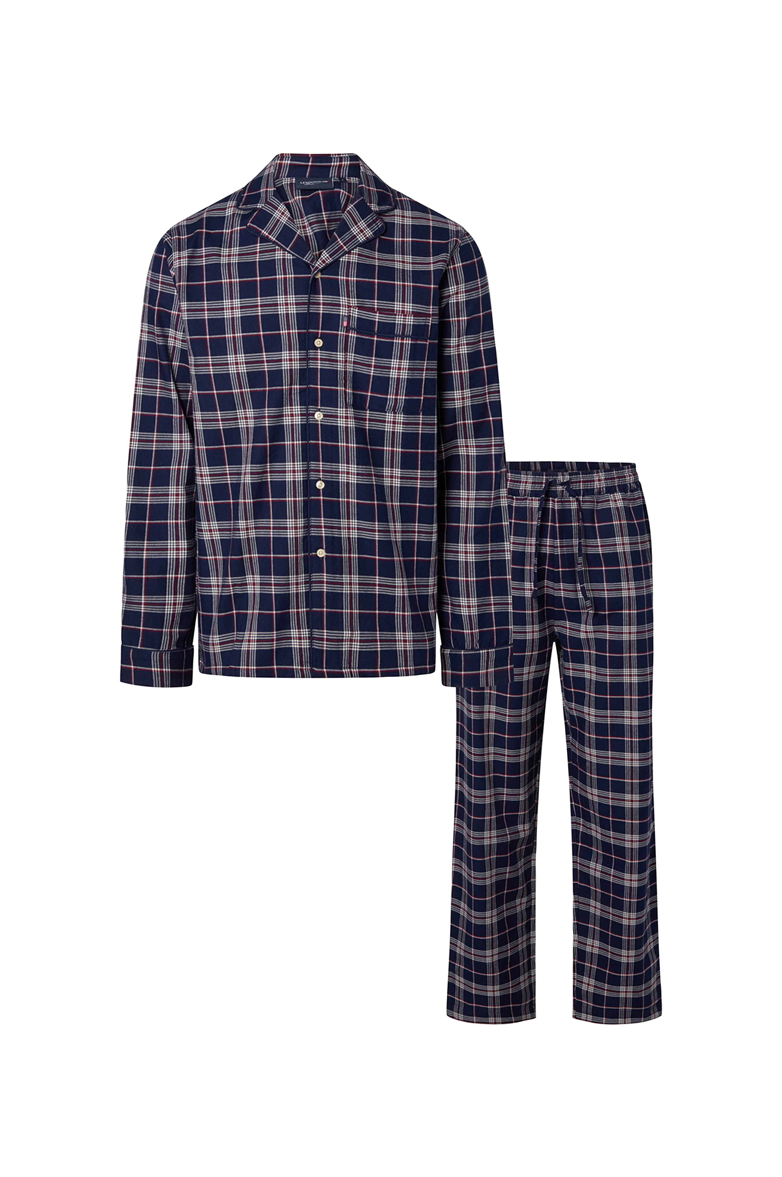 Nauti viihtyisistä öistä puuvillaisen ruutuflanellipyjamasettimme kanssa, jossa on ajaton sininen moniruutukuvio. Tässä harkitusti suunnitellussa yöpukusetissä on pitkähihainen paita, jossa on nappikiinnitys edessä ja rintatasku, sekä mukavat joustavat vyötäröiset housut, joissa on kiristysnauha täydellistä istuvuutta varten. Kauluksessa, rintataskussa, hihansuissa ja takataskussa olevat tyylikkäät putkitusyksityiskohdat tuovat tähän klassiseen pyjamamalliin hienostuneen lisän. Tämä 100-prosenttisesta puuvillasta valmistettu pehmeä flanellikangas antaa poikkeuksellisen lämpimän ja hengittävän olon, mikä takaa täydellisen mukavuuden koko yön ajan. Tämä yhteensovitettu setti sopii täydellisesti lomakaudelle ja sen jälkeen, ja se tekee nukkumaanmenosta ylellisen tuntuista.
