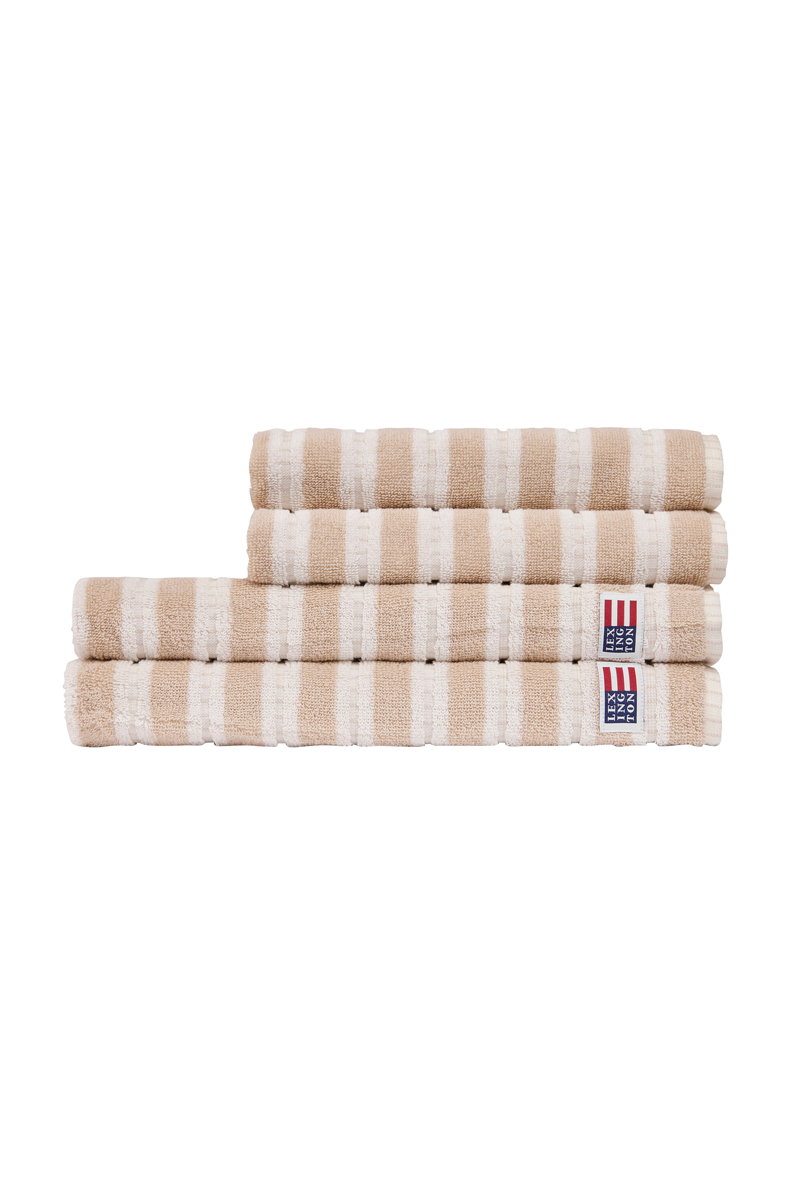 Paranna kylpyhuonekokemustasi vaaleanbeigen/luonnonvalkoisella raidallisella froteepyyhkeellä. Tämä ylellinen pyyhe on valmistettu 500 g/m²:n rengaspunotusta puuvillasta, ja se tarjoaa poikkeuksellisen imukykyisyyden ja pehmeyden, joka säilyy pesusta toiseen. Elegantit langavärjätyt raidat ja tarkasti taitetut reunat luovat hienostuneen ilmeen, joka sopii mihin tahansa kylpyhuoneen sisustukseen. Jokaisessa pyyhkeessä on Lexingtonin tunnusomainen lippulogo ja kätevä ripustuskoukku, joka helpottaa kuivattamista. Yhdistä pyyheeseen sopiva raidallinen unisex-kylpytakki, niin saat täydellisen, yhtenäisen ilmeen, joka tuo spa-tyylistä ylellisyyttä päivittäiseen rutiiniisi.