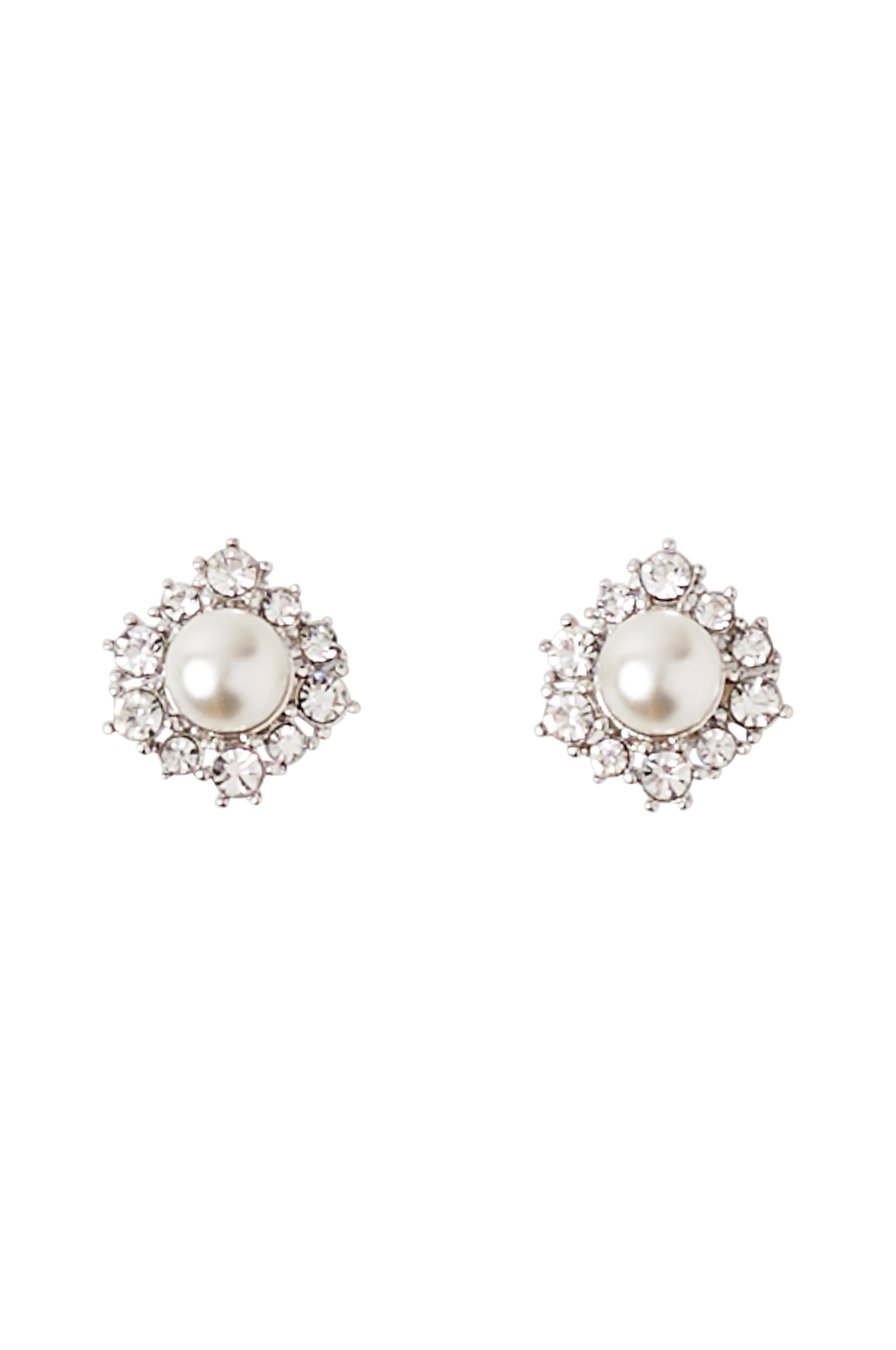 Korvakorut hopeoitua messinkiä. Helmi, ja sen ympärillä Swarovski-kristalleja. Halkaisija 1,3 cm.