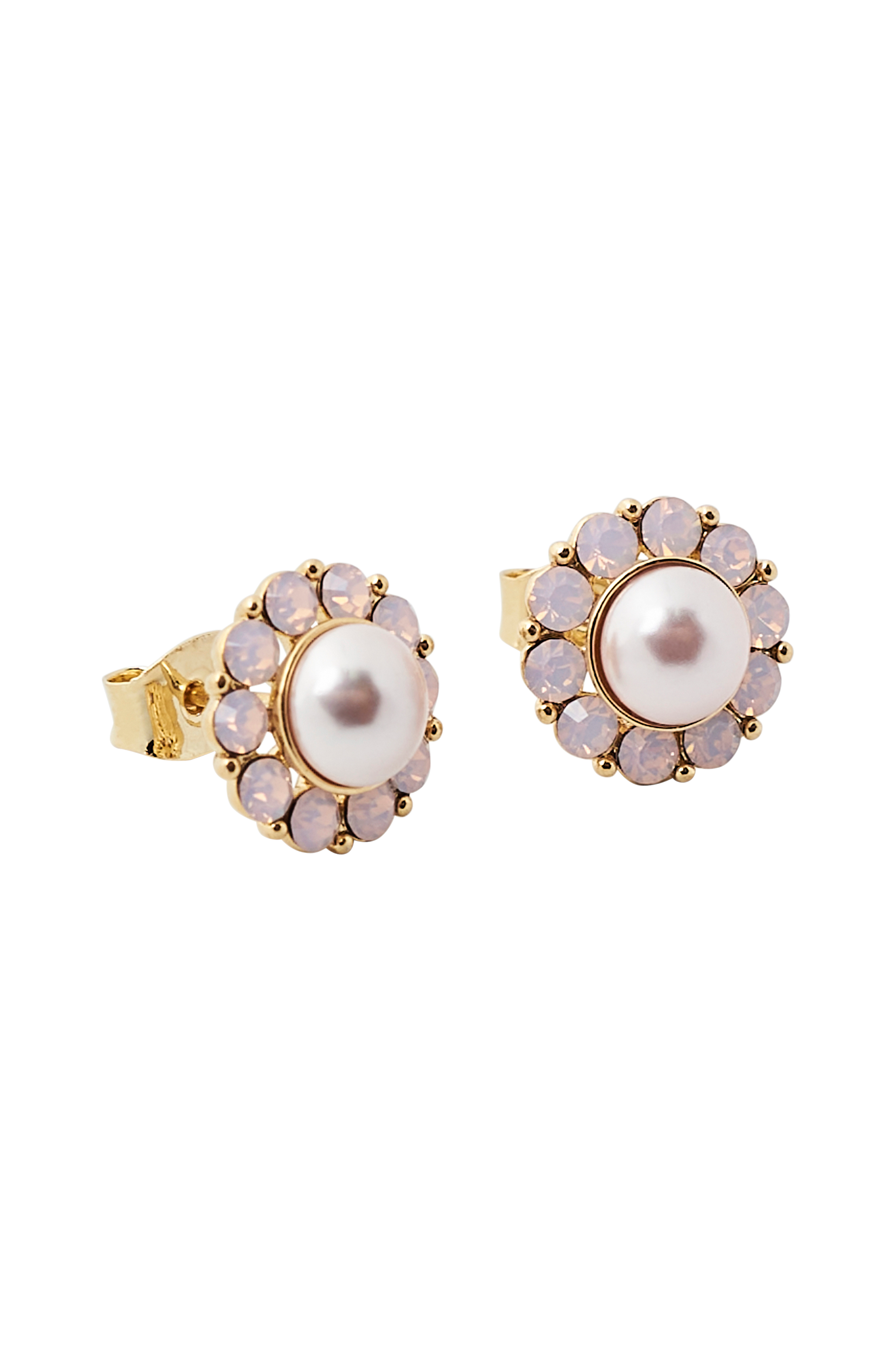 Pyöreät kimaltelevat korvakorut, joissa keskellä helmi, ja sen ympärillä kristalleja.Halkaisija 1 cm.