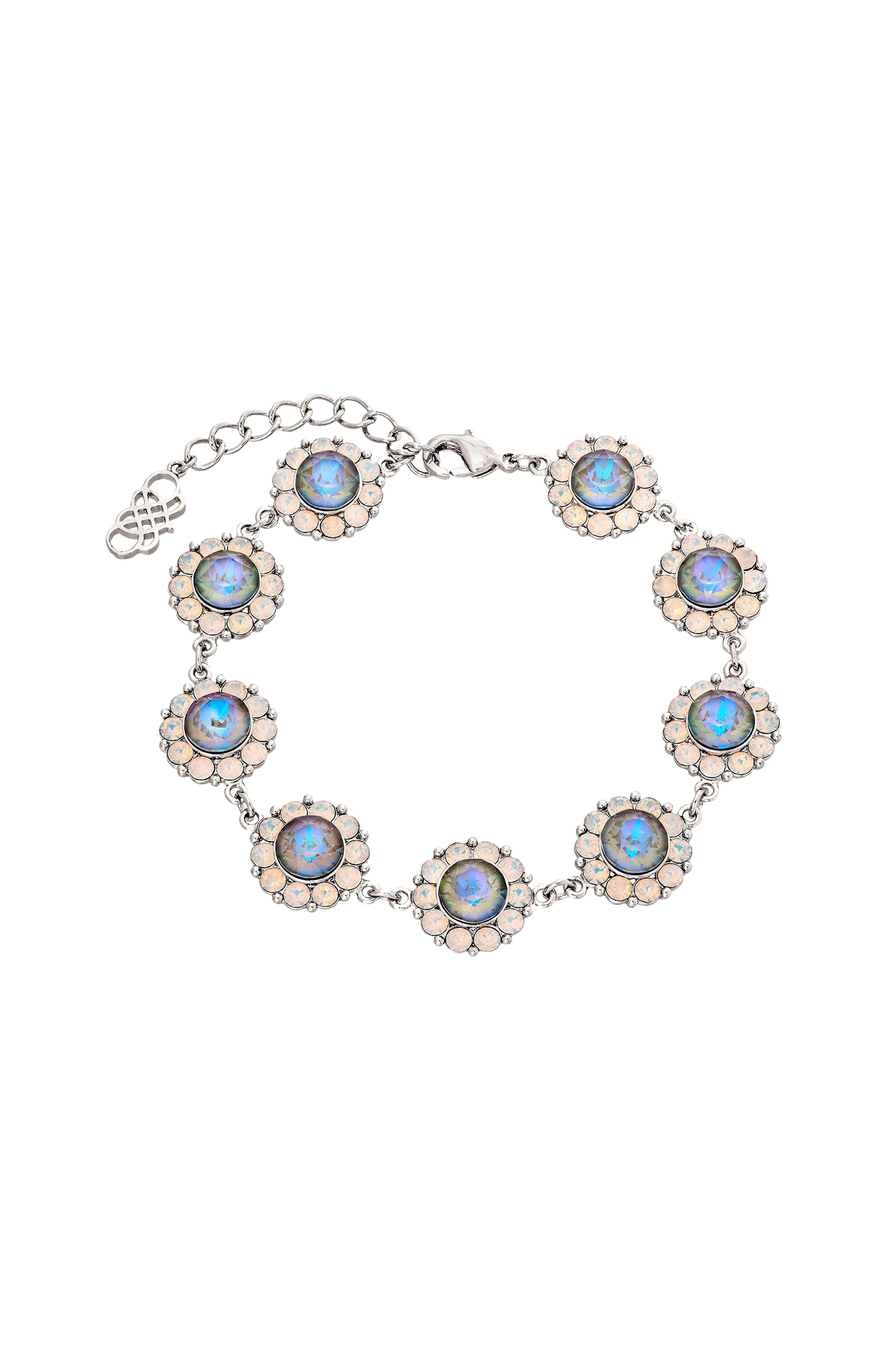 Rannekoru, jossa vaaleanharmaat, hiotut kivet ja niiden ympärillä opaalit. Hopeoitua messinkiä.Pituus 16-18,5 cm.