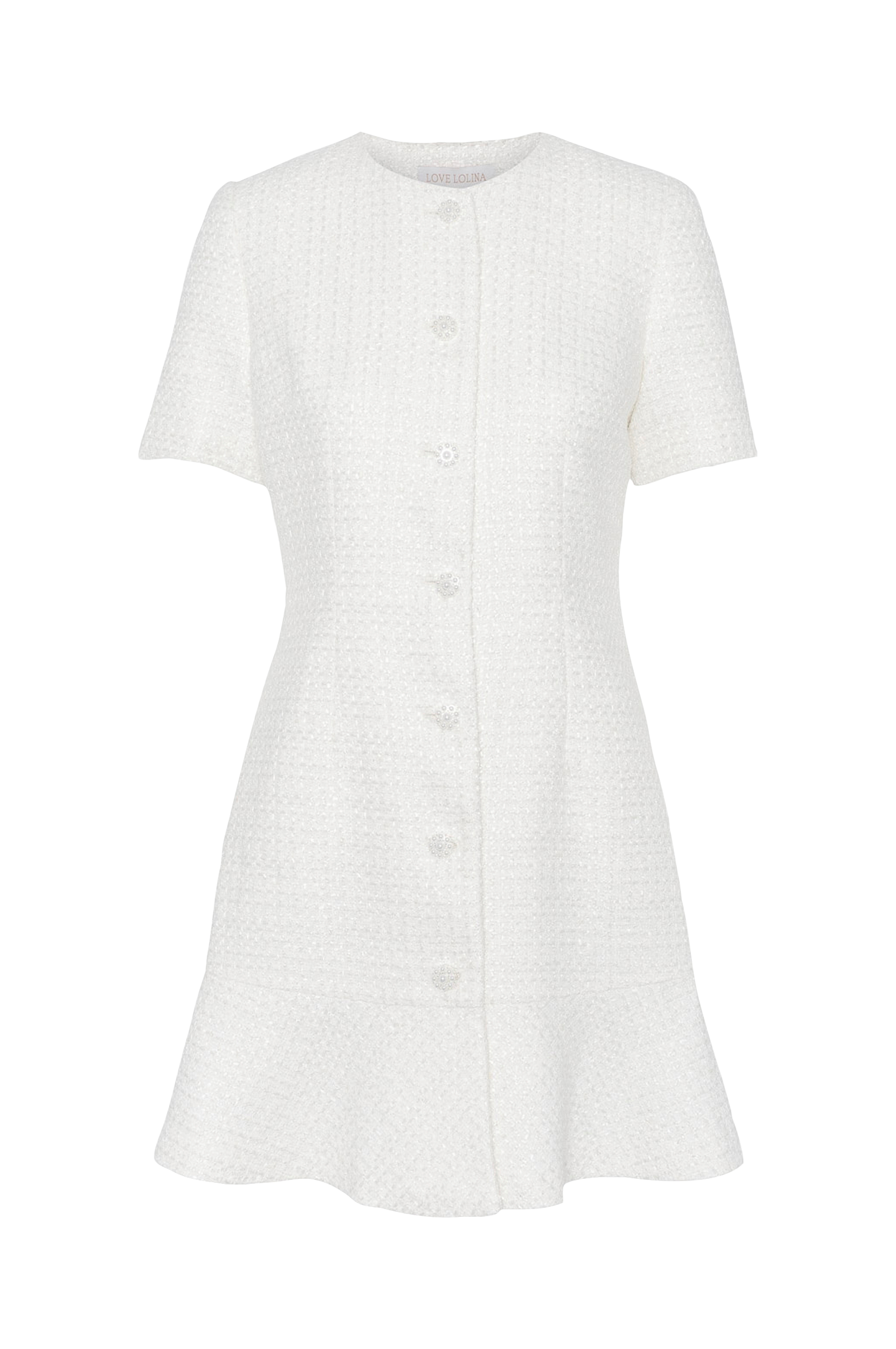 • Lyhyt, vuorattu mekko tweedistä• Olkatoppaukset• Veneen muotoinen kaula-aukko• Lyhyet hihat• Helminapit edessä• Laskos edessä ja takaosa• Röyhelö alahelmassa• Pituus: 85 cm koossa S