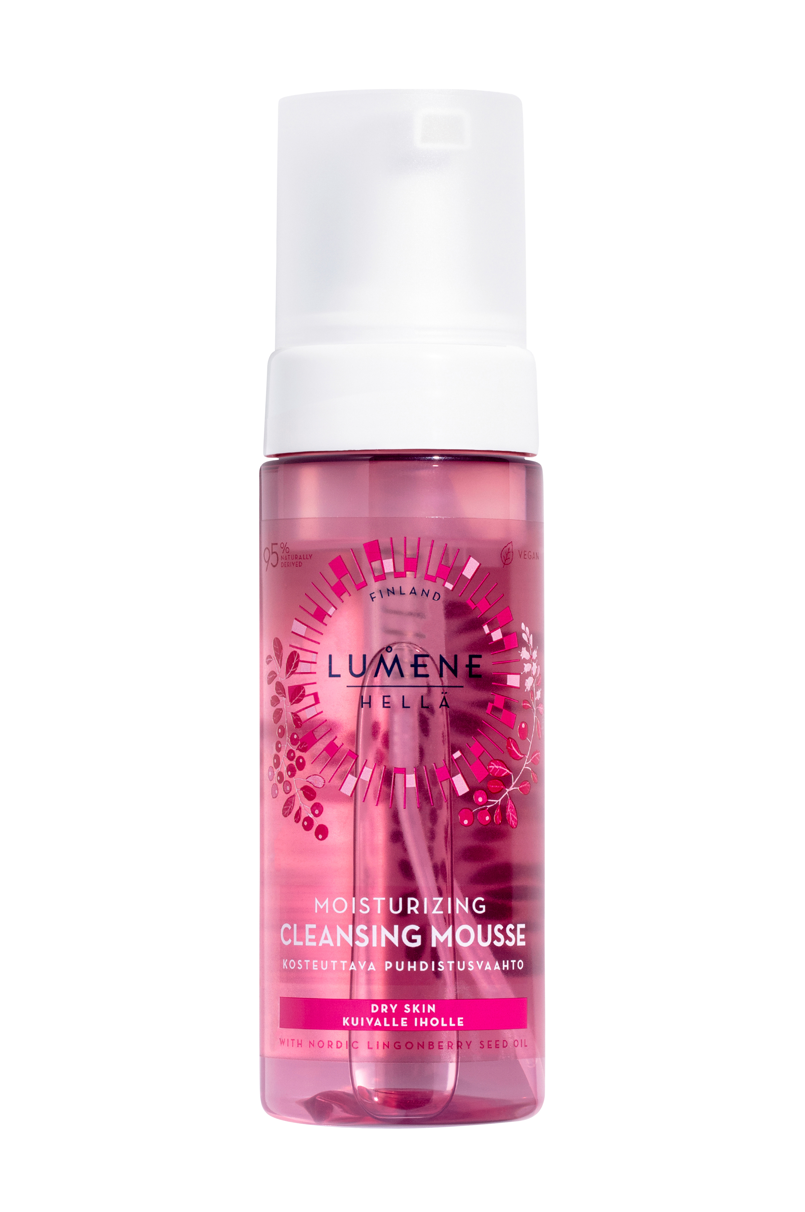 Lumene Hellä Moisturizing Cleansing Mousse -puhdistusvaahto normaalille ja kuivalle iholle poistaa tehokkaasti meikin ja epäpuhtaudet jättäen ihon miellyttävän pehmeän ja kosteutetun tuntuiseksi. Hoitavaa pohjoista puolukan siemenöljyä ja kosteuttavaa pohjoista puolukkavettä sisältävä hemmottelevan täyteläinen vaahto ei kuivata ihoa ja jättää ihon pehmeäksi puhdistuksen jälkeen. Vegaaninen.