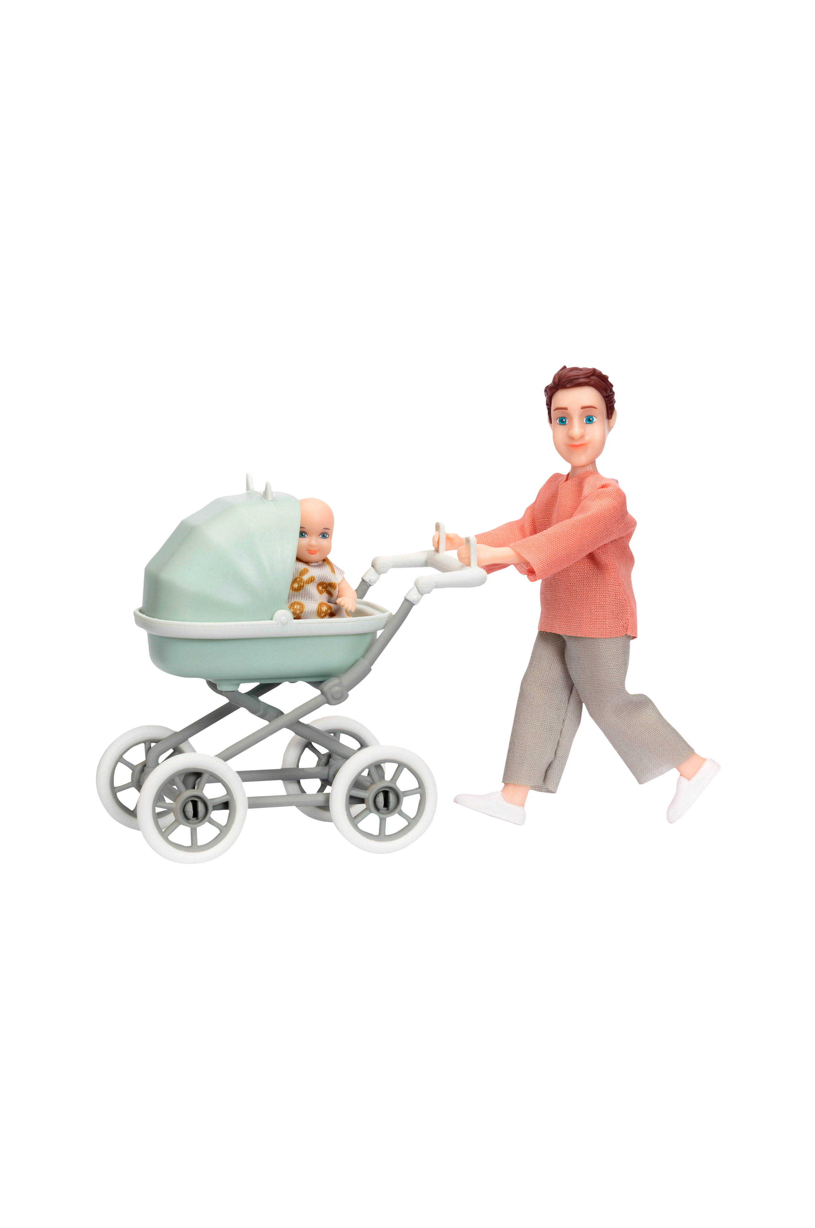 Kaksi nukkea, aikuinen ja vauva. Vauvalla on mukava makuupussi, joka sopii hyvin lastenvaunuihin. Lastenvaunuissa on pienet korvat, pyörivät pyörät ja fiksu aisa, johon nukke voi tarttua. Kuomua voidaan säätää eteenpäin ja taaksepäin.