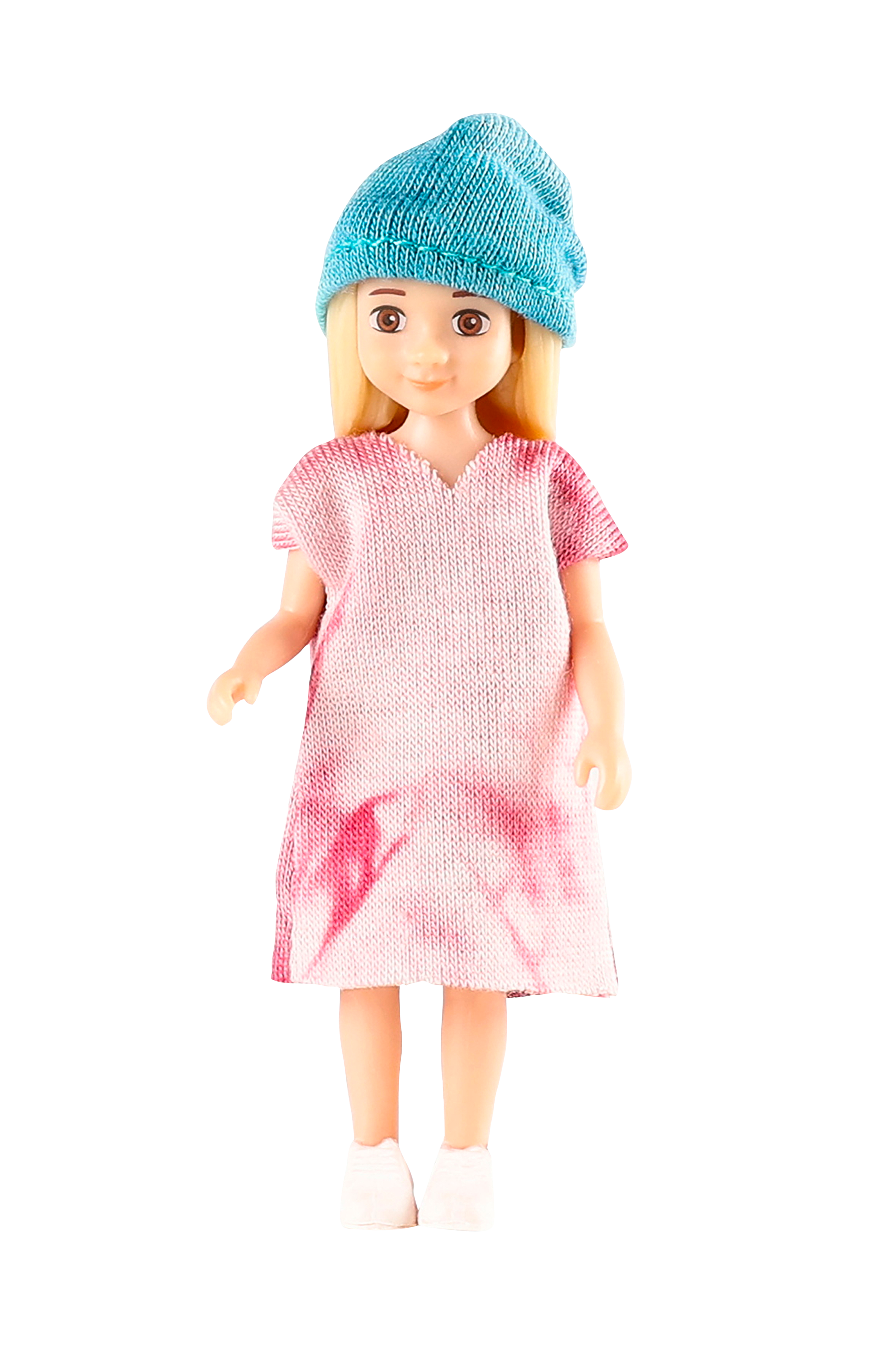 Nukkekodin nukke, jolla on kolme erilaista kampausta, mekko, pipo, T -paita, hame ja shortsit.