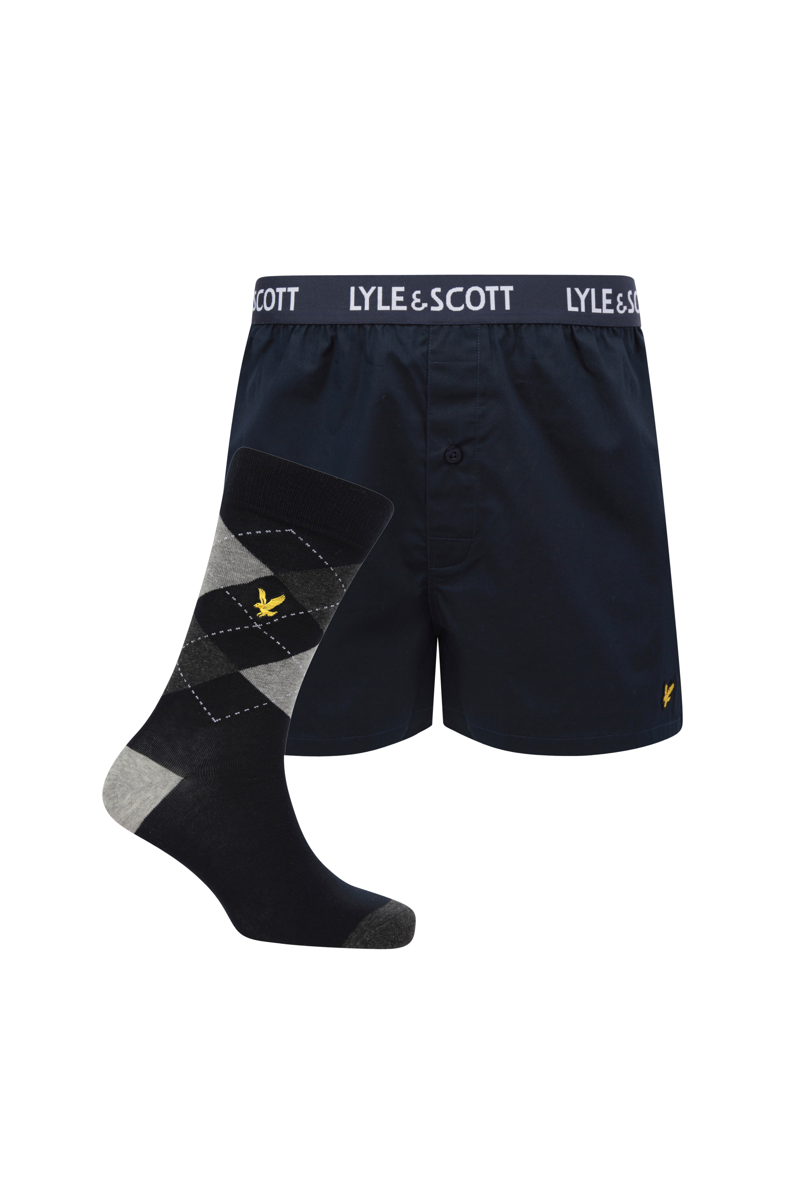 Lyle & Scott Jonas Boxer and Sock Pack -lahjapakkaus, jossa kangasbokserit ja sukat. Alushousuissa on vyötärönauhassa logo, sukissa on klassinen salmiakkikuvio ja varressa kirjailtu logo.