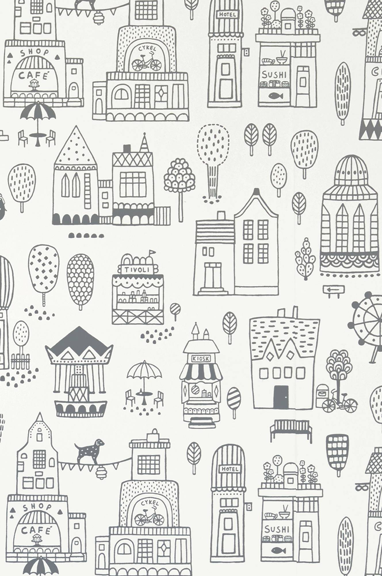 Tilaa Small Town -tapetti, musta/valkoinen, tuotenumerolla 1053154-02-0. Tapettirullan pituus 10,05 cm ja leveys 53 cm.