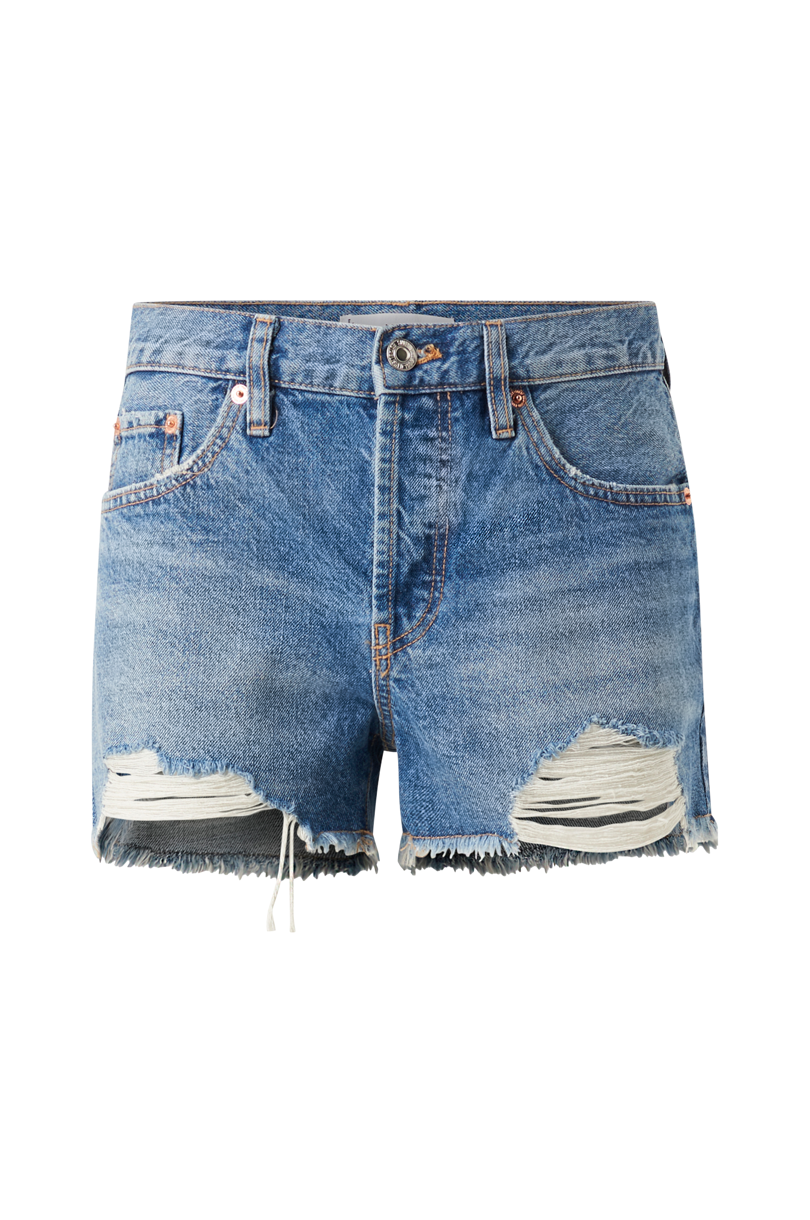 • Lyhyet shortsit denimistä kulumilla• Kätketty nappisepalus• Viisi taskua