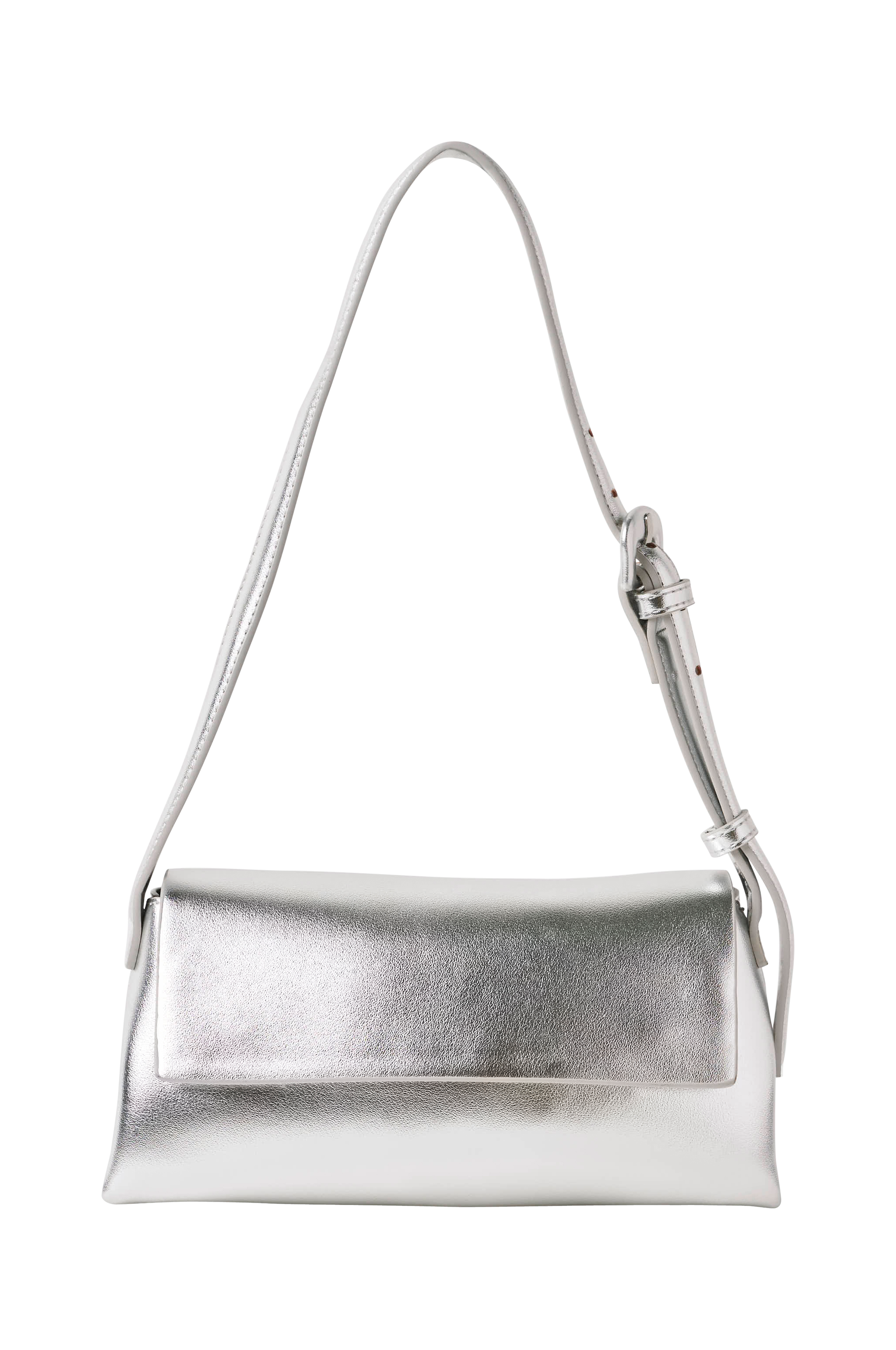 • Hopeanvärinen laukku PU:sta• Kansi magneettilukituksella• Säädettävä olkain• Mitat: B 24 x H 14 x D 7 cm