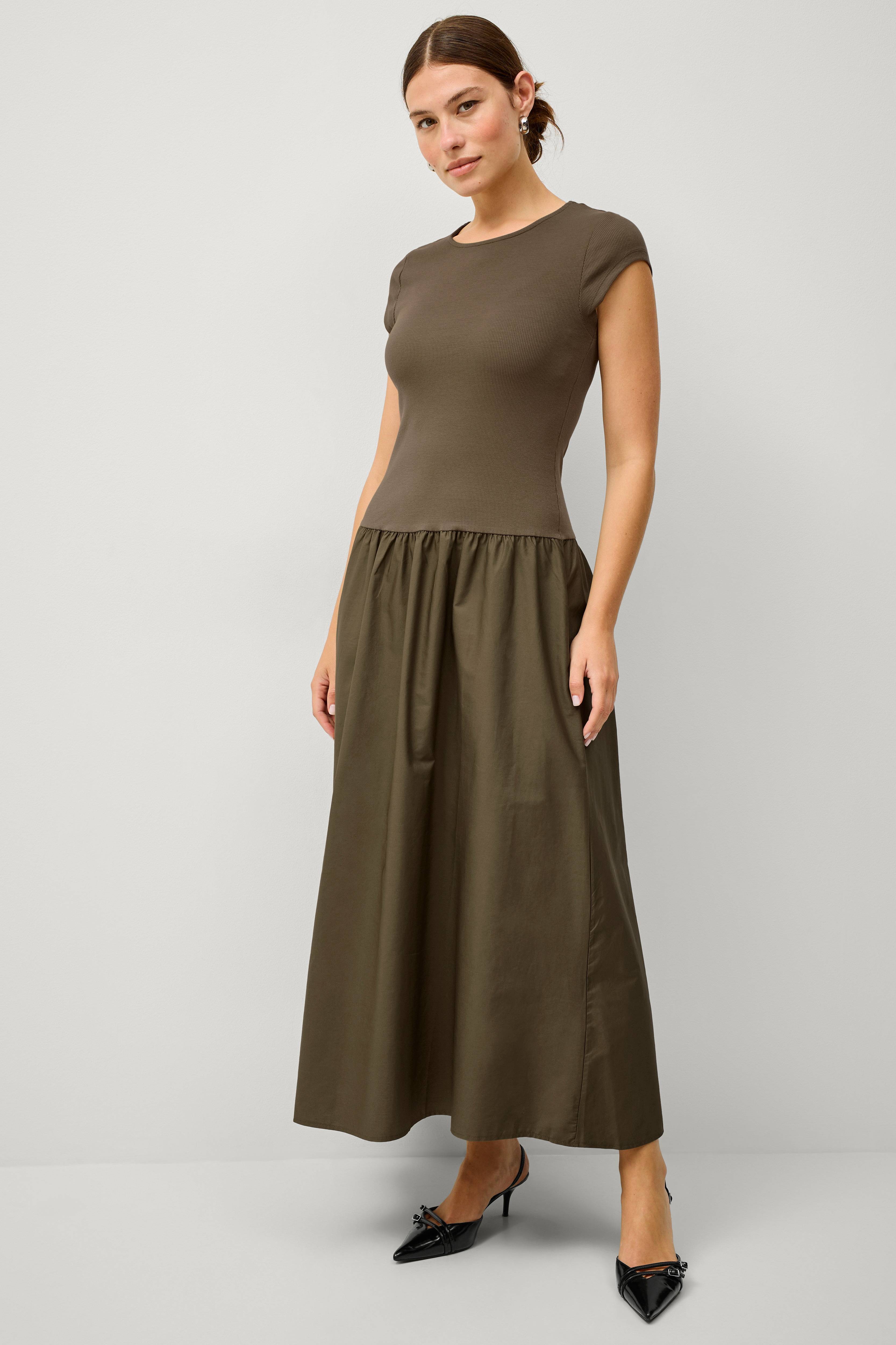 • Malli ribbineuloksella ylhäällä• Pyöreä pääntie• Lyhyt hiha• Poimu lantiolla leveällä, kudotulla hameella• Pituus: 135 cm koossa S