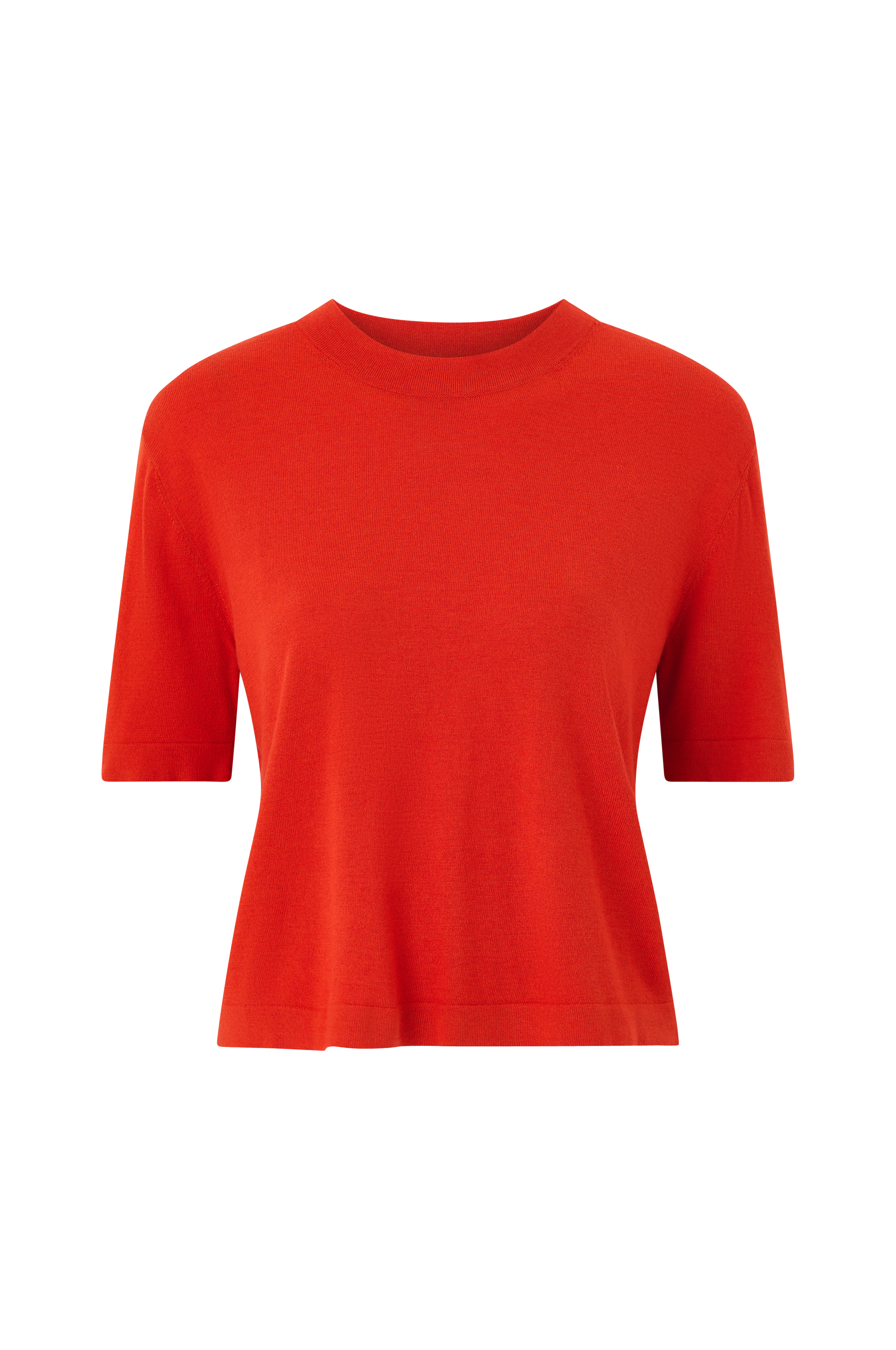 • Tiheäsilmukkainen, lyhythihainen pulloveri• Pyöreä kaula-aukko