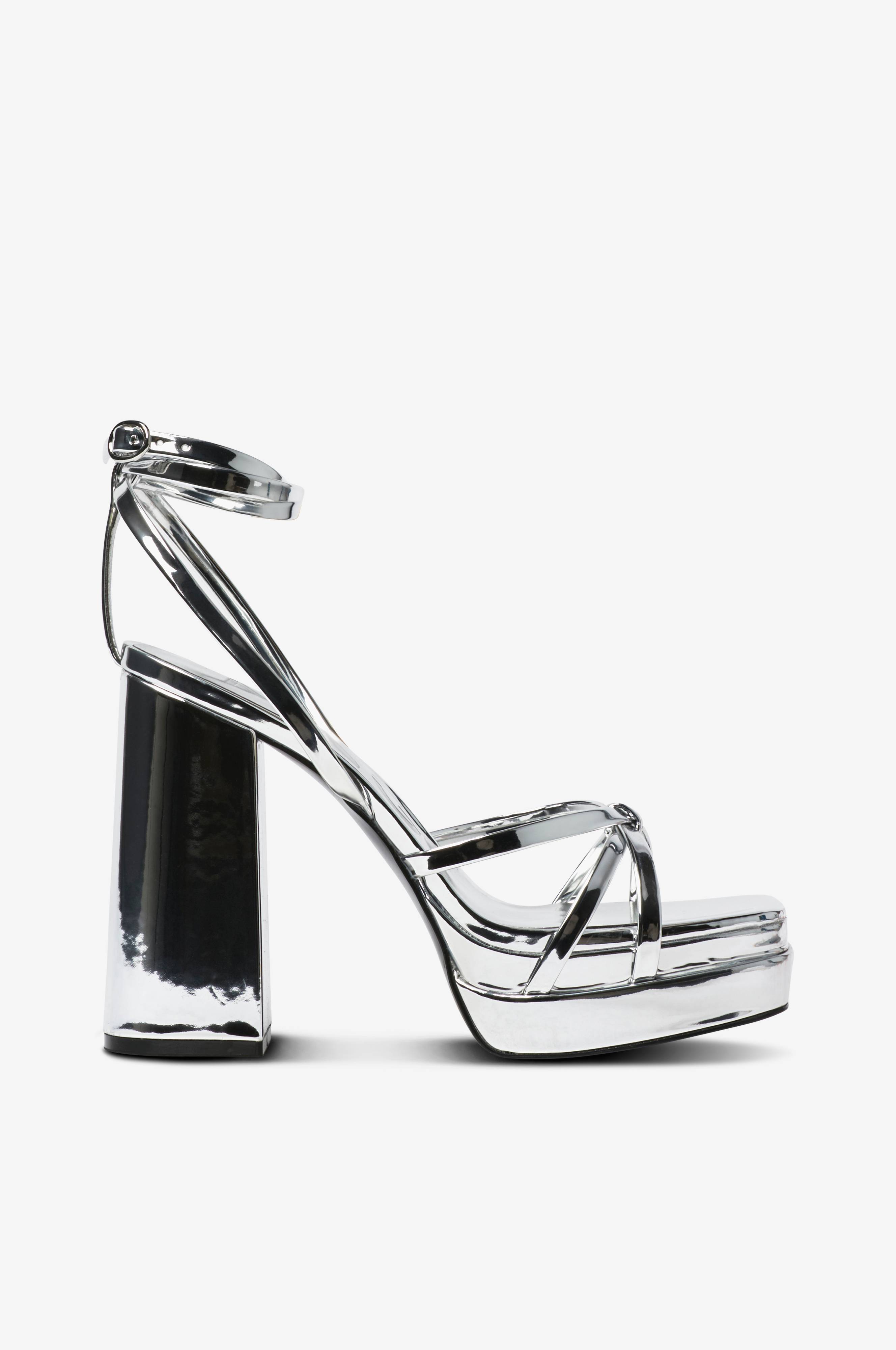 Hopeanväriset sandaletit, joissa kiiltävä pinta ja iso korko. Nilkkaremmi, jossa säädettävä metallisolki. Koron korkeus 11 cm. Pohjan korkeus 3 cm.