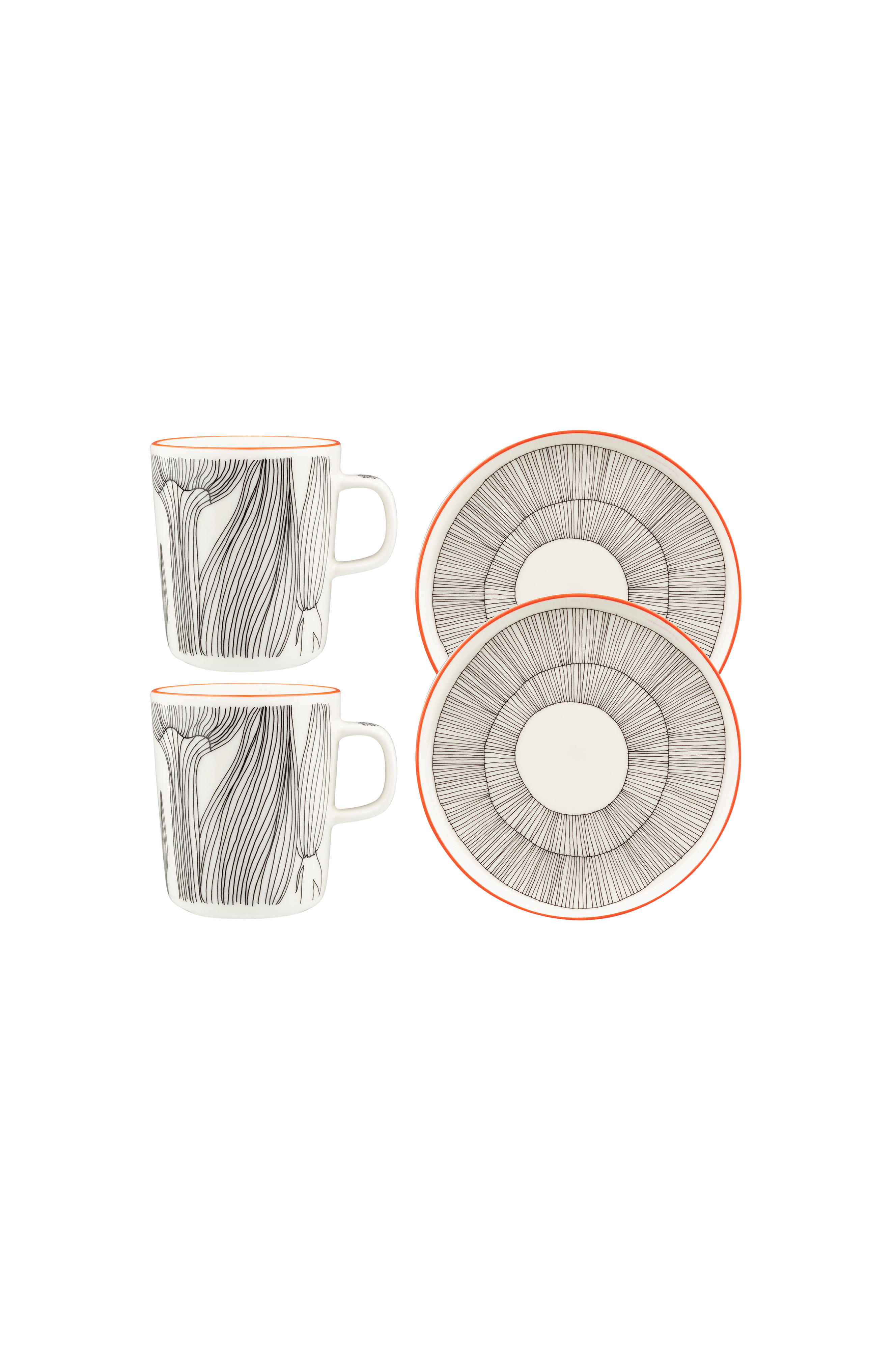 Kukat Puhkeavat kuvio Oiva -aamiaissetti sisältää kaksi 2,5 dl:n mukia ja kaksi 20 cm:n lautasta. Lautasissa on käsin maalatut reunukset, ja mukien kahvassa on pieni kukka. Tuotteet on valmistettu valkoisesta kivitavarasta, ja ne ovat astianpesukone-, uuni-, mikroaaltouuni- ja pakastinkestäviä. Setti on pakattu Marimekko Logo -kuvioiseen laatikkoon.