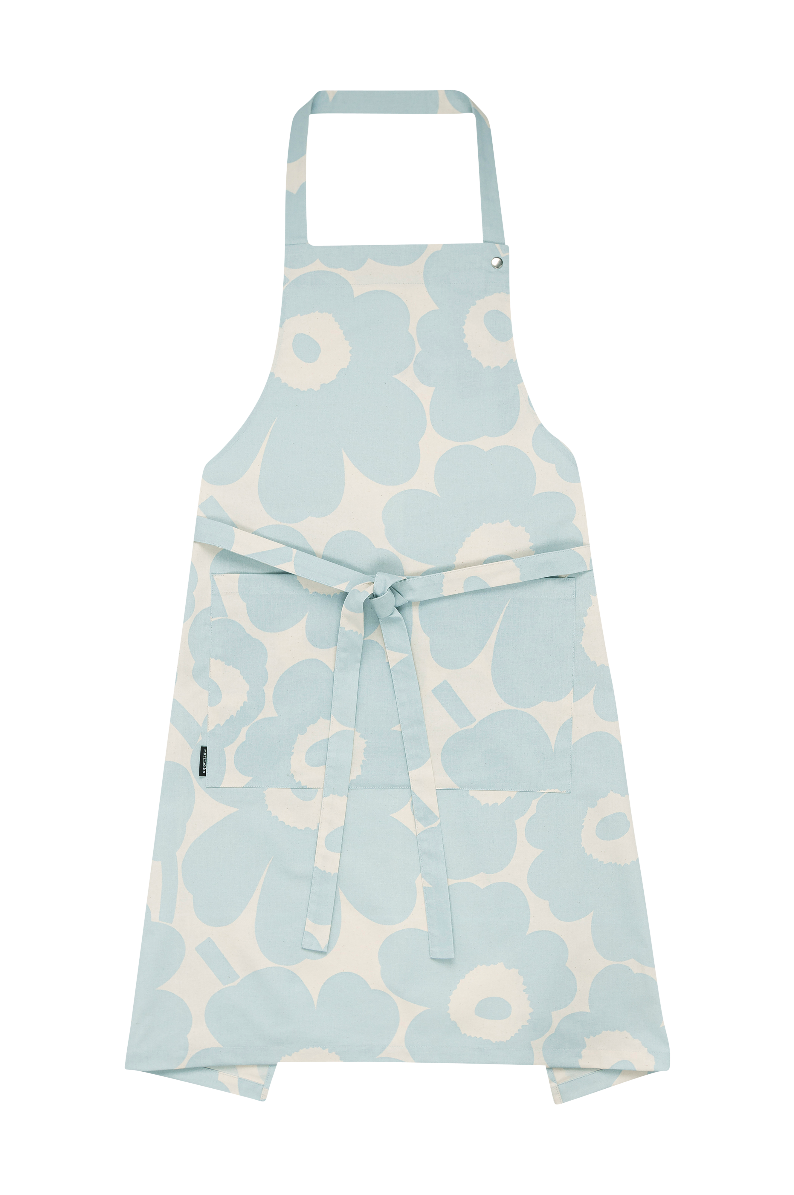 Esiliina valkaisematonta puuvillaa, jossa Pieni Unikko -kuvio. Painettu Helsingissä. Esiliinassa on edessä tasku ja niskassa säädettävä nauha. Tuotteen kuosi on painettu indigonsinisellä luonnonvärillä, joka on uutettu suomalaisesta morsinko-kasvista. Väri voi haalistua hieman ensimmäisissä pesuissa ja käytössä. Marimekon kuuluisa Unikko-kuvio luotiin vuonna 1964, jolloin valikoimissa suosittiin paljon abstrakteja kuvioita. Muotoilija Maija Isola halusi luoda tästä teemasta jotakin uudenlaista ja kiinnostavaa, ja suunnitteli kokonaisen sarjan vahvoja kukkakuoseja. Nykyään ikoninen kukkakuvio symbolisoi luovuutta.