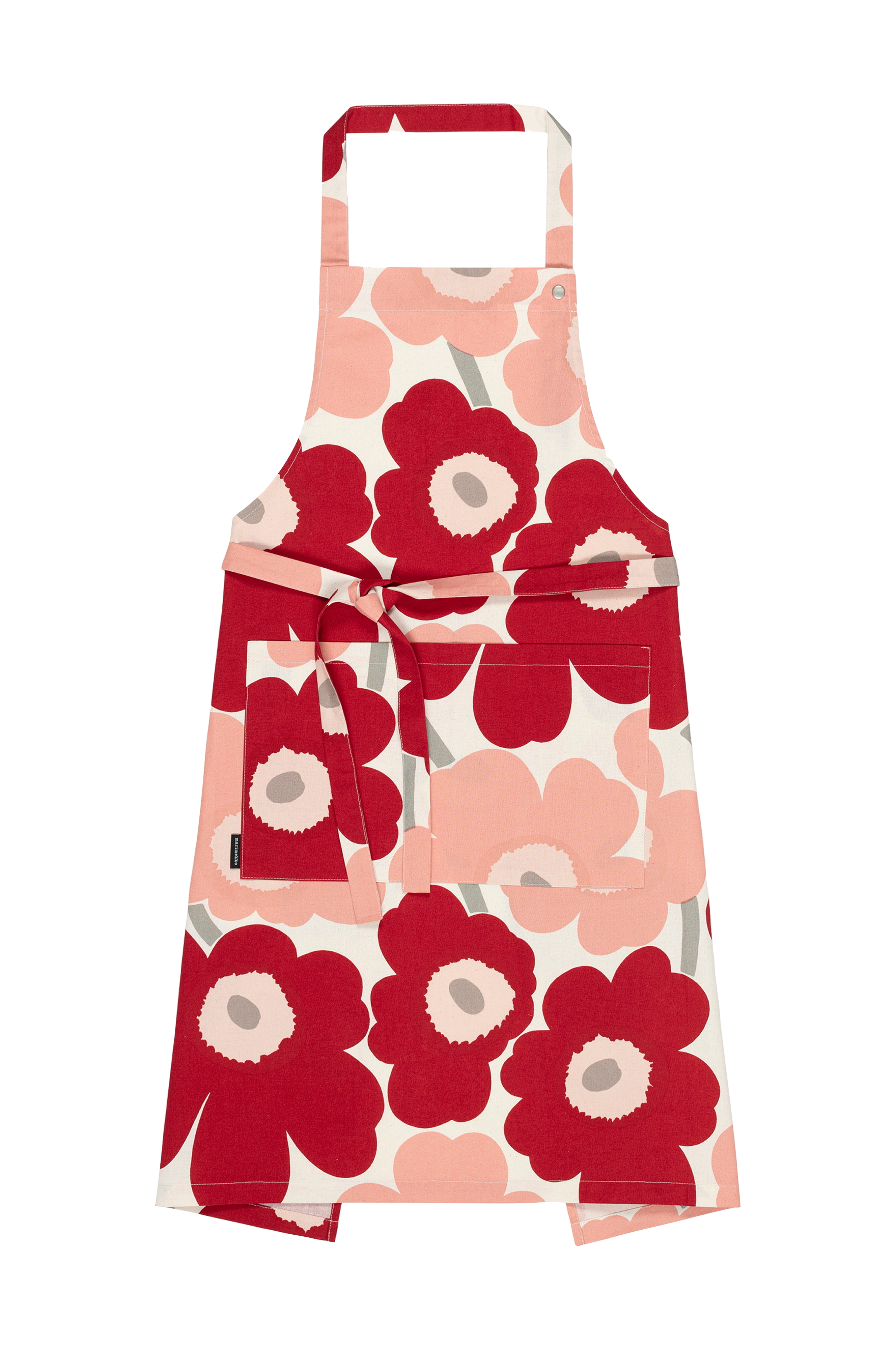 Pieni Unikko -kuvioinen esiliina on valmistettu valkaisemattomasta puuvillasta, joka on painettu Helsingissä. Esiliinassa on etutasku ja säädettävä kaulanauha. Valkaisemattomassa puuvillakankaassa on luonnollisen elävä väri ja pinta, jossa voi näkyä pieniä puuvillakasvista peräisin olevia tummia pisteitä. Tuotteiden välillä voi olla eroja tämän ominaisuuden suhteen. Unikko Maija Isola loi esiliinan vuonna 1964, ja siitä on sittemmin tullut kansainvälinen painomuotoilun ikoni. Marimekon perustaja Armi Ratia oli sitä mieltä, että aitojen kukkien todellista olemusta ei ole mahdollista vangita uskollisesti painokuviin, minkä vuoksi kukkapainatukset jätettiin aiemmin pois Marimekon mallistoista. Niinpä Maija Isola suunnitteli Unikko niin, että se on pikemminkin abstraktio kukasta kuin fotorealistinen toisinto. Nykyään Unikko on voimakas ilon ja luovuuden symboli, joka on integroitu saumattomasti Marimekon design-identiteettiin.