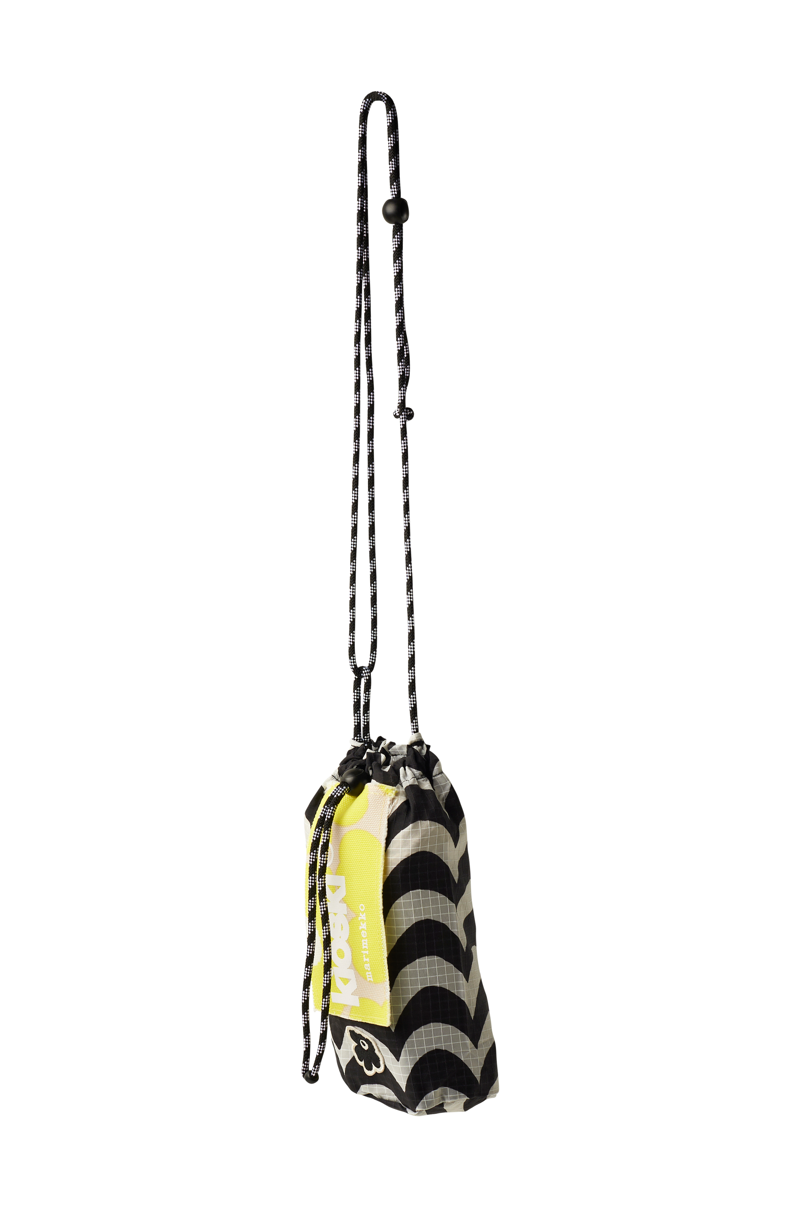 Kevyt kangaslaukku, johon mahtuu noin 0,5 litran kokoinen pullo. Suljetaan kiristysnyörillä. Säädettävä olkahihna. Etupuolella oleva raakareunainen Unikko-kuosinen kangaspala on valmistettu kierrätetystä puuvillakanvaasista. Kangaspalat on leikattu koko kankaan leveydeltä, ja tämän vuoksi niiden ulkoasu saattaa hieman vaihdella. Jokainen tuote on ainutlaatuinen. Tuotteen päämateriaali on valmistettu 100-prosenttisesti kierrätetystä polyesteristä. Koko 10x23 cm.