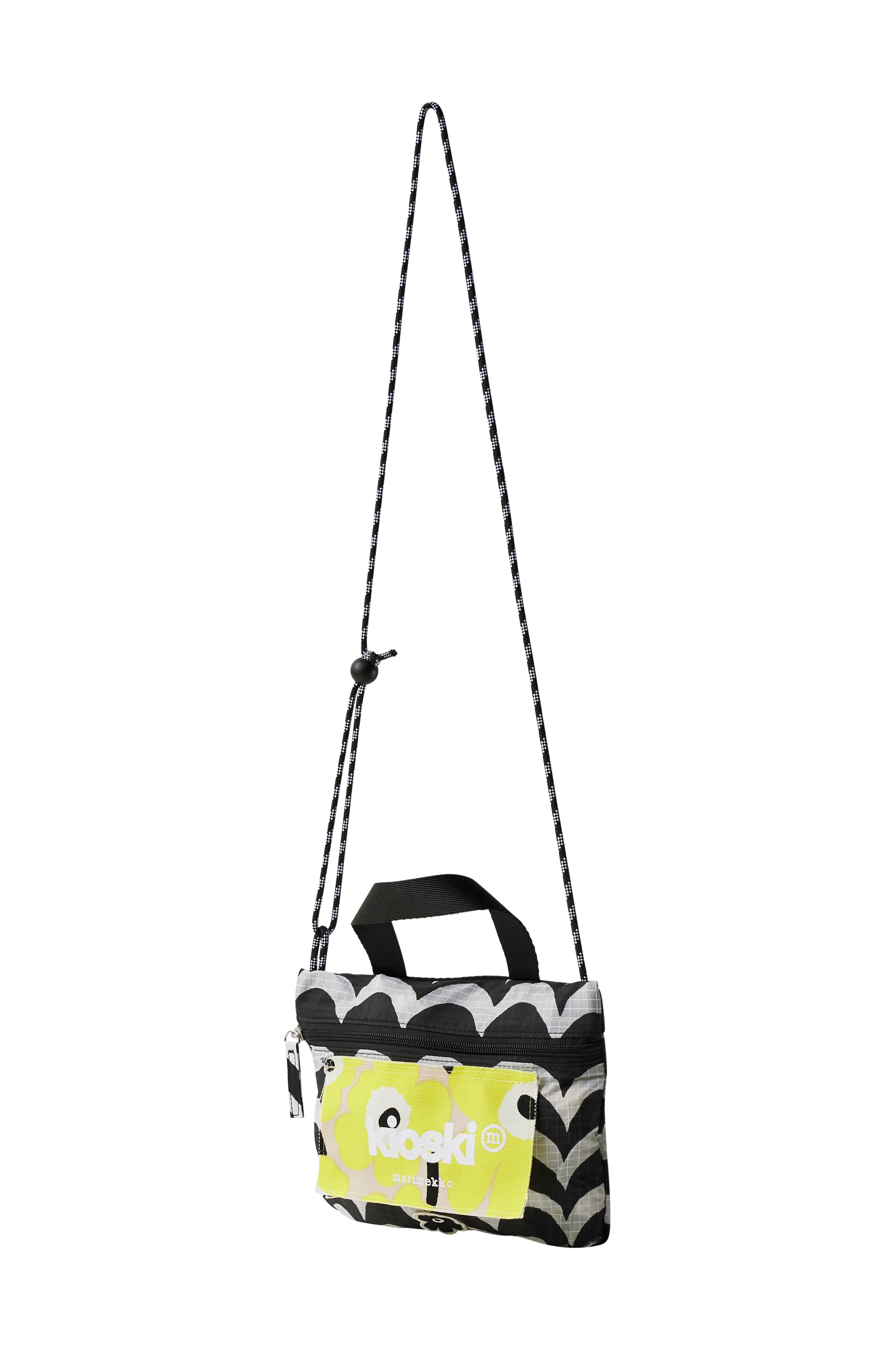 Pieni, kevyt kangaslaukku. Kantokahva ja kapea säädettävä olkahihna. Vetoketjusuljenta. Etupuolella oleva raakareunainen Unikko-kuosinen kangaspala on valmistettu kierrätetystä puuvillakanvaasista. Kangaspalat on leikattu koko kankaan leveydeltä, ja tämän vuoksi niiden ulkoasu saattaa hieman vaihdella. Jokainen tuote on ainutlaatuinen. Tuotteen päämateriaali on valmistettu 100-prosenttisesti kierrätetystä polyesteristä. Koko 19x24 cm.