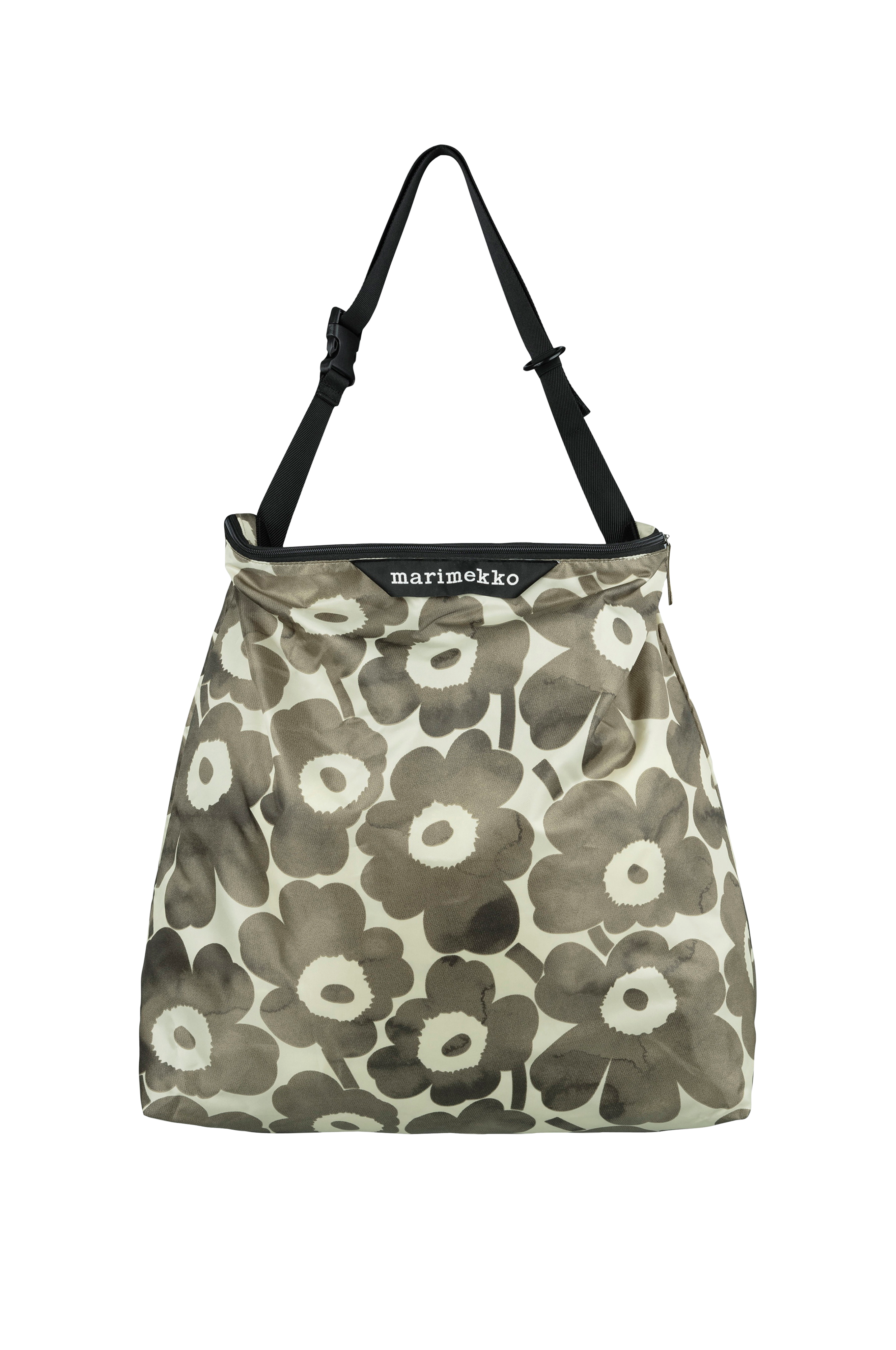 Neat Crossbody L -olkalaukku on Unikko -kuvioinen. Laukussa on säädettävä olkahihna. Laukussa on vetoketjukiinnitys, Marimekko-merkki edessä ja sisäpuolella on sisäänvedettävä tasku, johon koko laukun voi taittaa pois säilytystä varten.