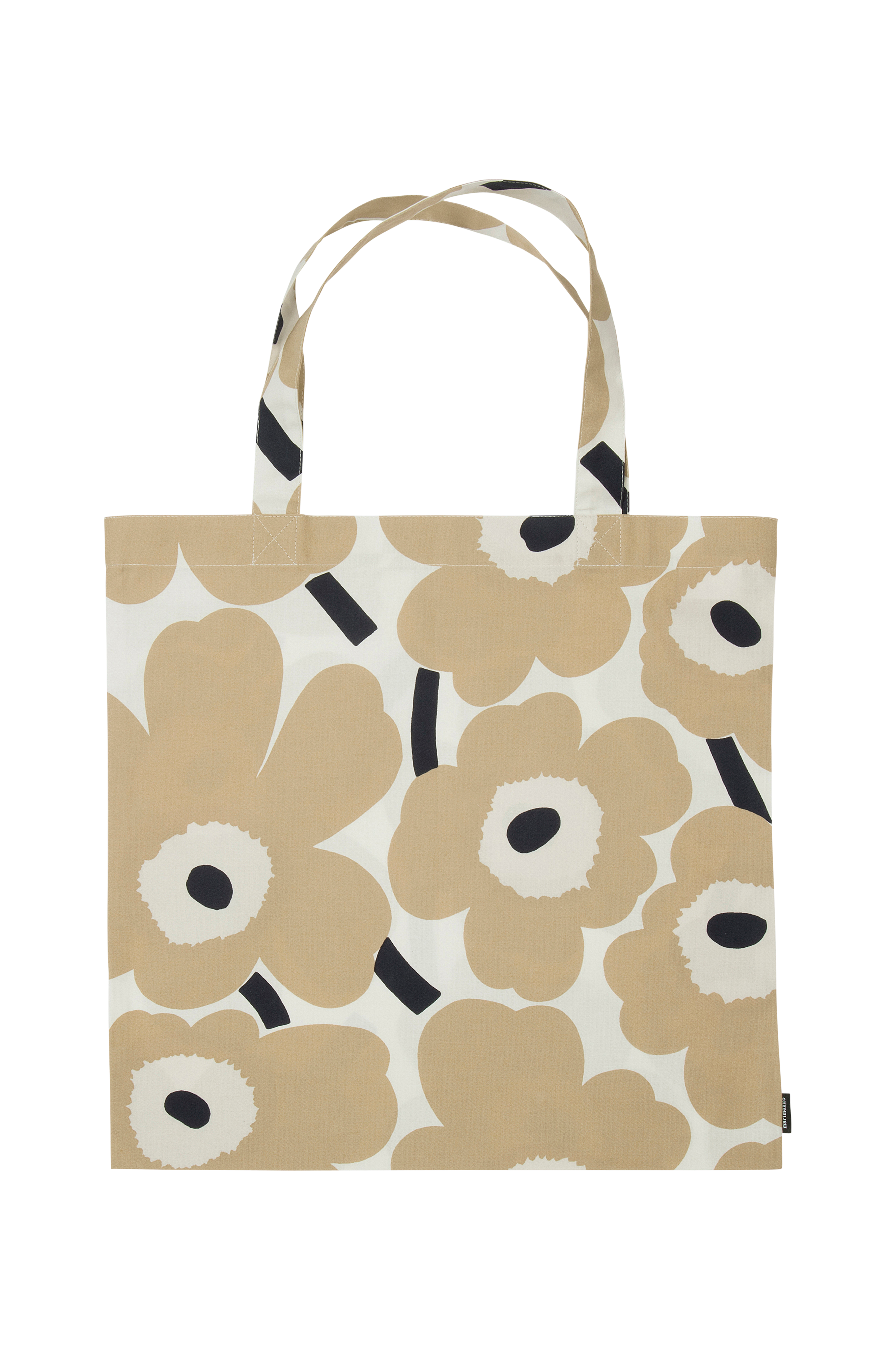 Kätevä puuvillalaukku, jossa punainen/tummanpunainen Pieni Unikko -kuvio. Kevyt laukku, jonka voi helposti taittaa kokoon ja säilyttää toisessa laukussa jolloin se on aina mukana. Painettu Helsingissä. Unikko syntyi vuonna 1964 sen jälkeen, kun Marimekon perustaja Armi Ratia oli päättänyt kieltää kukkakuvioiset mallistot. Maija Isola vastusti Armin päätöstä ja suunnitteli vastalauseeksi kokonaisen sarjan kauniita kukkakuoseja. Yksi niistä oli Unikko, joka kertoo luovuudesta, voimasta, rohkeudesta ja uskosta omaan itseensä. Koko 44x43 cm.