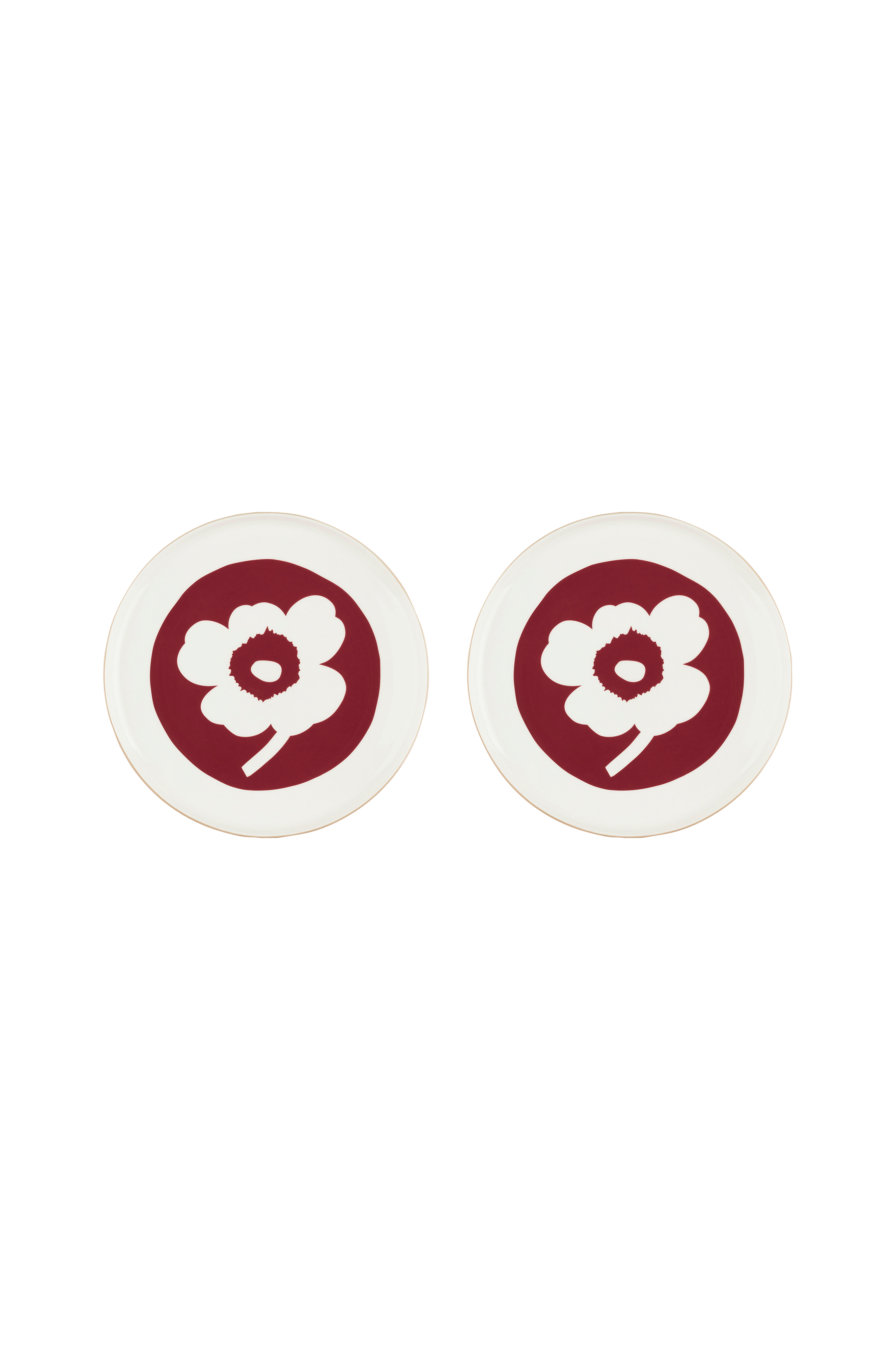 Tämä setti sisältää kaksi 25 cm Oiva-lautasta, jotka on valmistettu valkoisesta kivitavarasta. Lautasissa on keskellä Unikko -kukka ja ruskeat, käsin maalatut reunukset. Lautaset ovat astianpesukoneen, uunin, mikroaaltouunin ja pakastimen kestäviä. Setti on pakattu Marimekon Logo-kuosirasiaan. Unikko on Maija Isolan vuonna 1964 luoma ja siitä on sittemmin tullut kansainvälinen painetun muotoilun ikoni. Marimekon perustaja Armi Ratia oli sitä mieltä, että aitojen kukkien todellista olemusta ei ole mahdollista vangita uskollisesti painokuviin, minkä vuoksi kukkapainatukset jätettiin aiemmin Marimekon mallistojen ulkopuolelle. Niinpä Maija Isola suunnitteli Unikko niin, että se on pikemminkin abstraktio kukasta kuin fotorealistinen toisinto. Nykyään Unikko on voimakas ilon ja luovuuden symboli, joka on integroitu saumattomasti Marimekon design-identiteettiin.