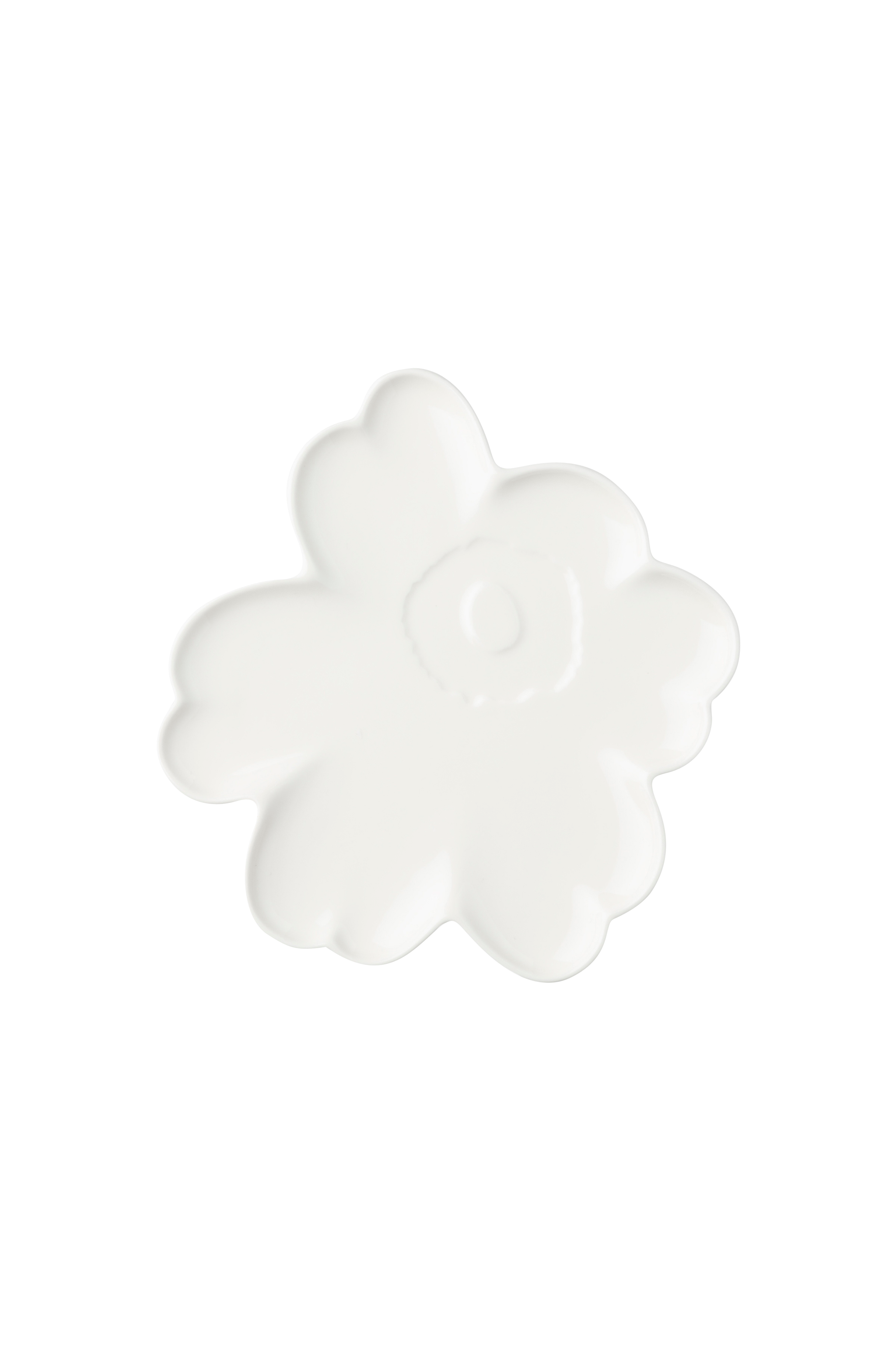 Unikko kukkien muotoinen lautanen on valmistettu valkoisesta kivitavarasta. Suosittelemme lautasen pesemistä käsin. Vaikka sen voi pestä koneessa, ainutlaatuinen muotoilu saattaa vahingoittua, jos se joutuu kosketuksiin muiden astioiden kanssa. Tämä tuote juhlistaa Unikko -kuvion 60-vuotisjuhlavuotta, ja sen pohjassa on debossattu Marimekko-logo. Lautanen on pakattu Unikko 60-vuotisjuhlarasiaan.