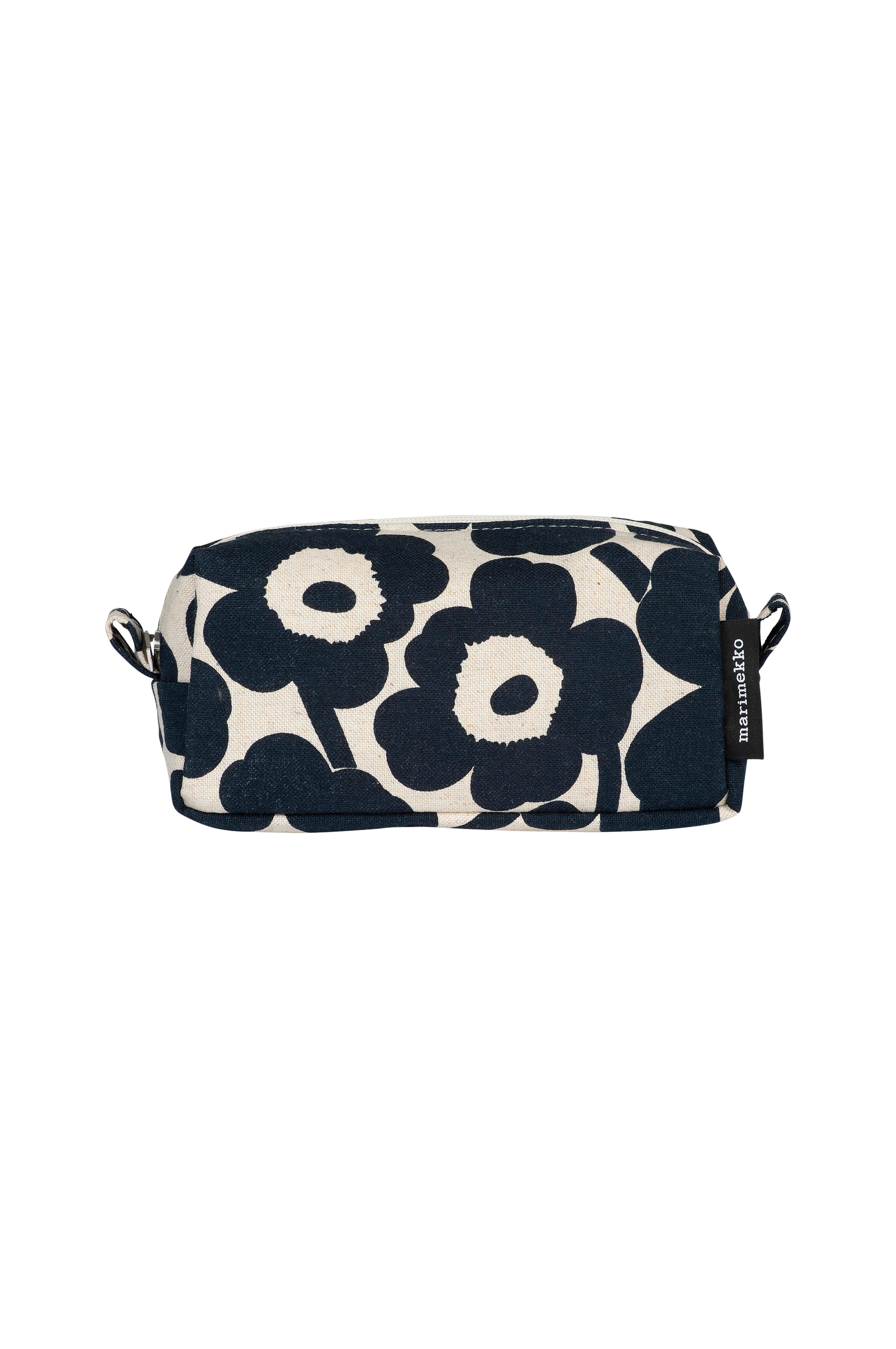 Tiise-meikkipussi valkaisematonta puuvilla-pellavasekoitetta, jossa likaahylkivä ulkopinta. Vetoketju yläreunassa, sisäpinta nailonia. Tummansininen Mini Unikko -kuvio on painettu Helsingissä. Luovuutta symboloiva Unikko-kuvio syntyi aikana, jolloin Marimekon kokoelmissa ei juuri kukkakuvioita ollut nähty. Maija Isolaa kukkakuviot kuitenkin kiehtoivat, joten hän päätti suunnitella kokonaisen uuden kokoelman kukikkain kuosein. Mitat 18 x 9 x 7 cm.