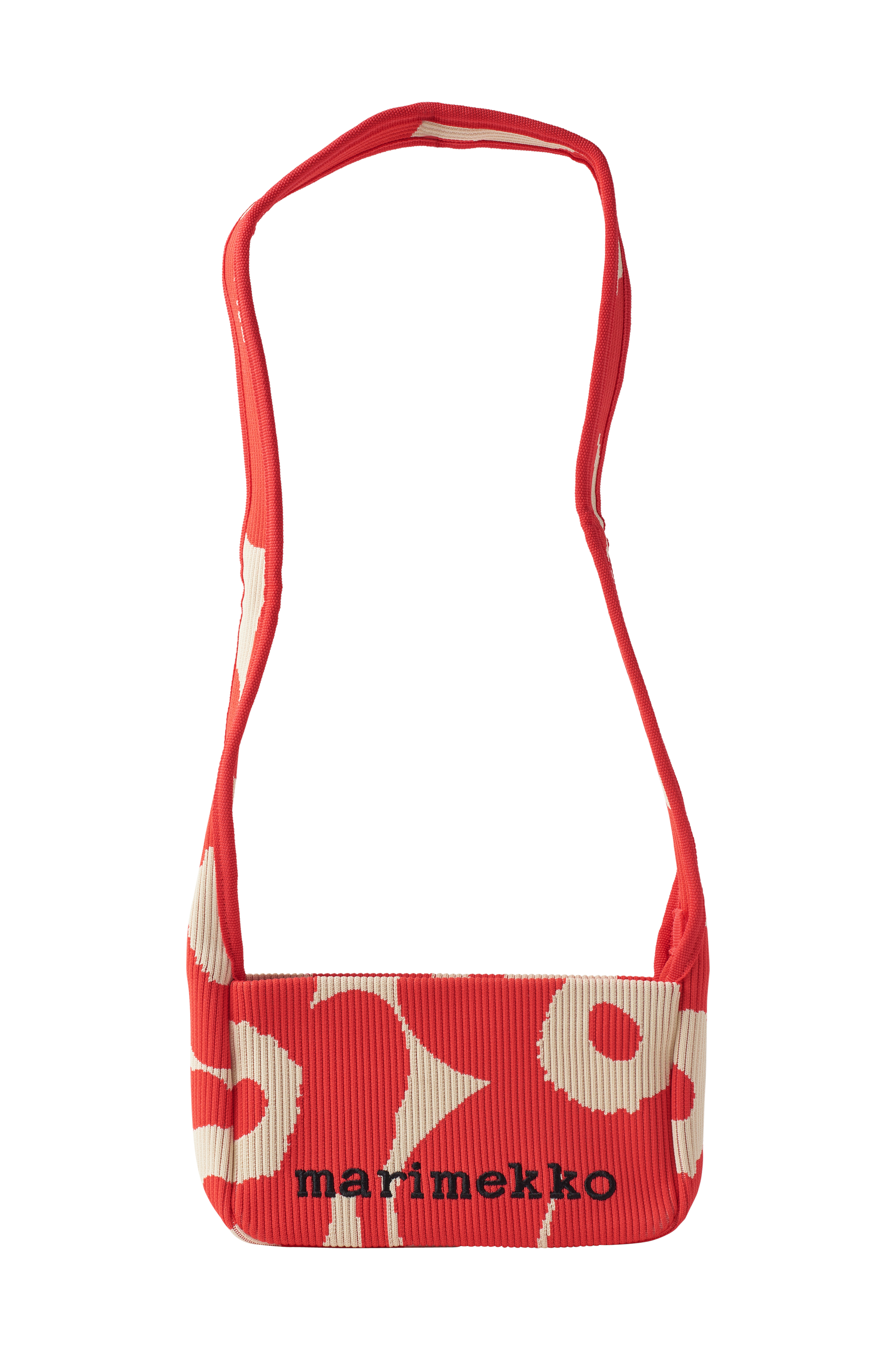 Neuleessa Mini Shoulderbag on jacquardneule Unikko -kuvio, ja se on valmistettu lujasta kierrätetystä polyesteristä, jossa on kylkikuvio. Laukussa on leveä olkahihna, vetoketjukiinnitys ja kirjailtu Marimekko-logo edessä.