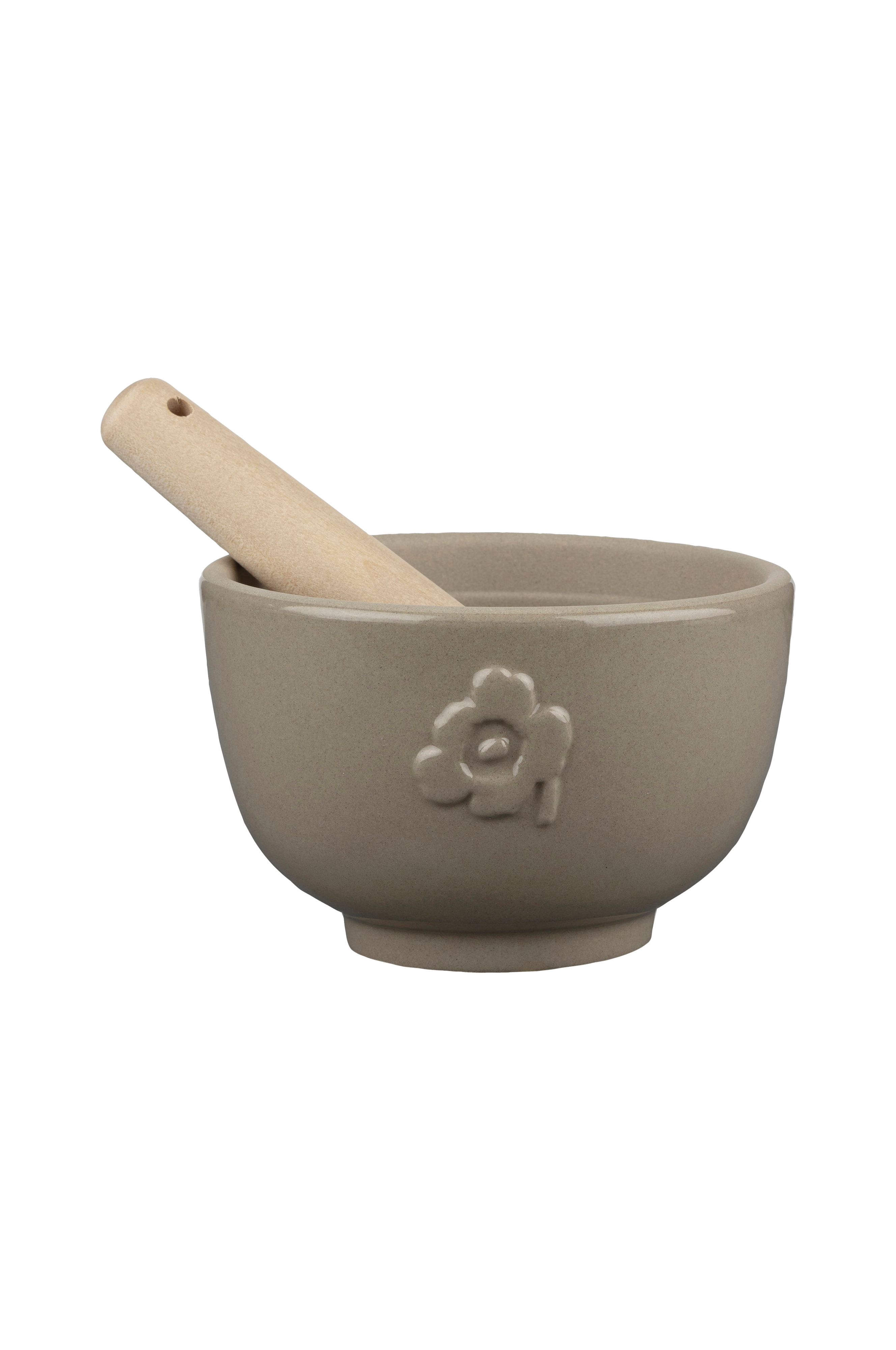 Mortteli ruskeaa kivitavaraa, jossa kirkas lasitus. Ulkosivulla pintakuvioitu Unikko. Luonnollisen karhea sisäpinta, jossa hienontamista helpottavat urat. Survin valkoista kivitavaraa. Suosittelemme survimelle käsinpesua. Mortteli kestää konepesun. Tuote toimitetaan lahjapakkauksessa. Marimekon kuuluisa Unikko-kuvio luotiin vuonna 1964, jolloin valikoimissa suosittiin paljon abstrakteja kuvioita. Muotoilija Maija Isola halusi luoda tästä teemasta jotakin uudenlaista ja kiinnostavaa, ja suunnitteli kokonaisen sarjan vahvoja kukkakuoseja. Nykyään ikoninen kukkakuvio symbolisoi luovuutta. Poista tuotetarra pohjasta ennen käyttöä. Tarra sisältää pienen määrän metallia.
