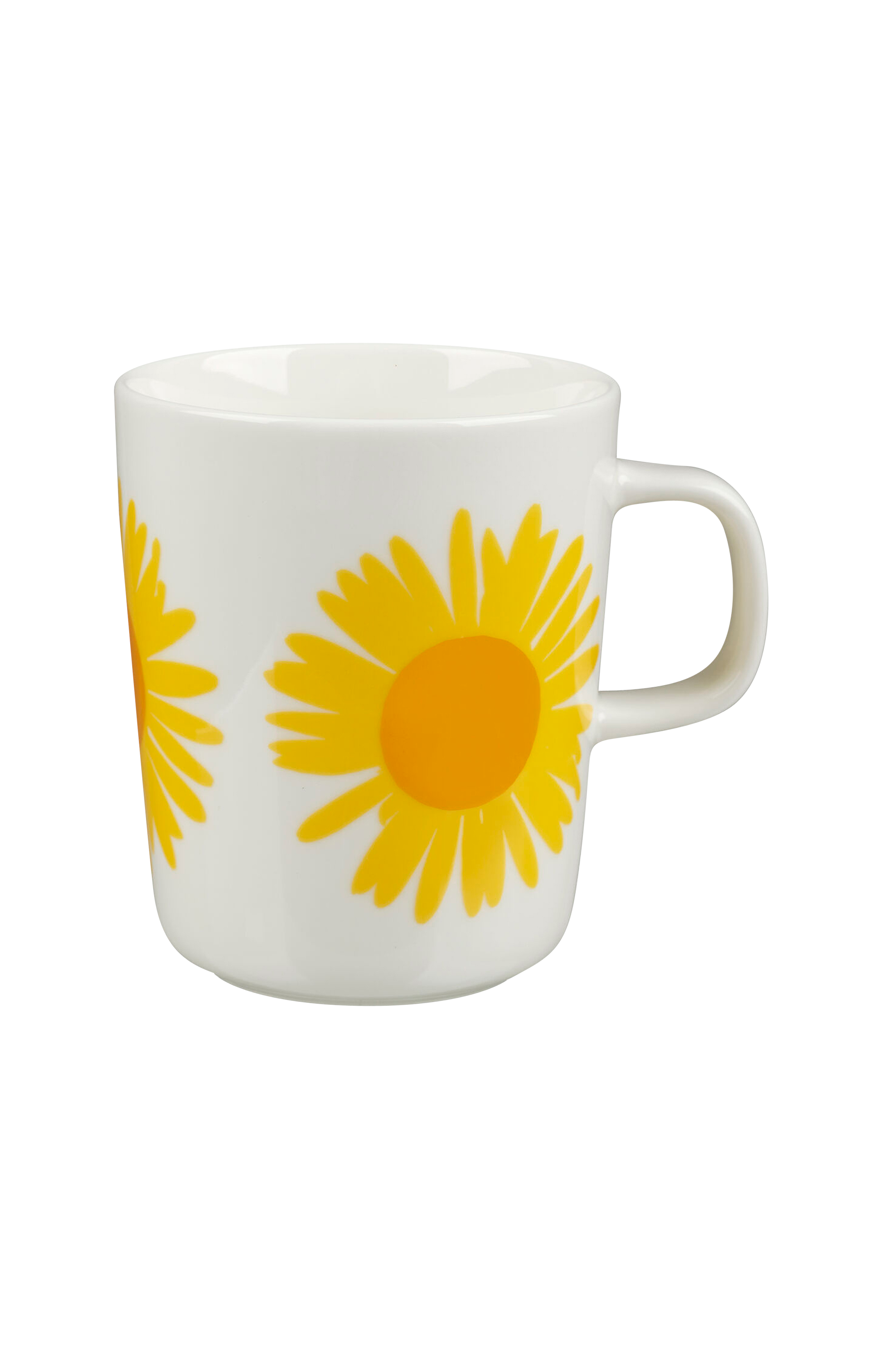 Valkoista kivitavaraa, joka kestää konepesun, kuumennuksen uunissa ja mikroaaltouunissa sekä pakastuksen. Poista tuotteen pohjassa oleva tarra ennen käyttöä. Tarra sisältää pienen määrän metallia. 1950-luvun lopulla Maija Isola suunnitteli Marimekolle laajan sarjan kankaita, joiden kuvioaiheet ilmensivät hänen syvää rakkauttaan luontoon. Tuohon sarjaan kuului myös ilahduttava Auringonkukka-kuosi.