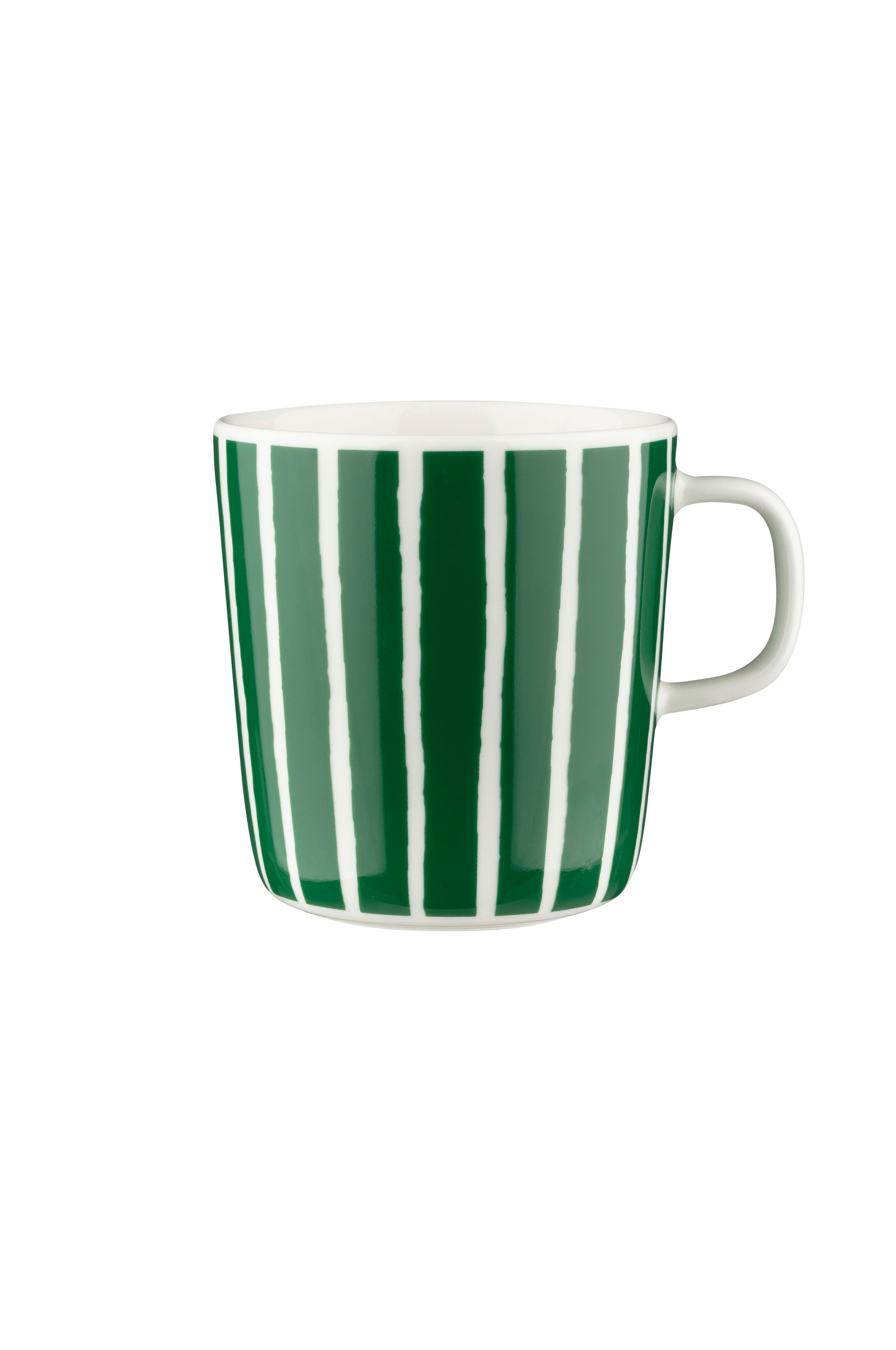 Oiva-muki, jossa on Piccolo kuvio, on valmistettu valkoisesta kivitavarasta, joka on astianpesukoneen, uunin, mikroaaltouunin ja pakastimen kestävä. Poista tarra tuotteen pohjasta ennen käyttöä. Tarra sisältää pienen määrän metallia. Vuokko Eskolin-Nurmesniemi loi vuonna 1953, samana vuonna kun hän liittyi Marimekkoon, Piccolo, eloisilla siveltimenvedoilla maalatun raidallisen kangaskuvion. Kolme vuotta myöhemmin kankaasta tehty Jokapoika-paita ilmestyi kauppoihin ja kaduille - ilmeisesti lopullisesti. 9,5 x 10 cm