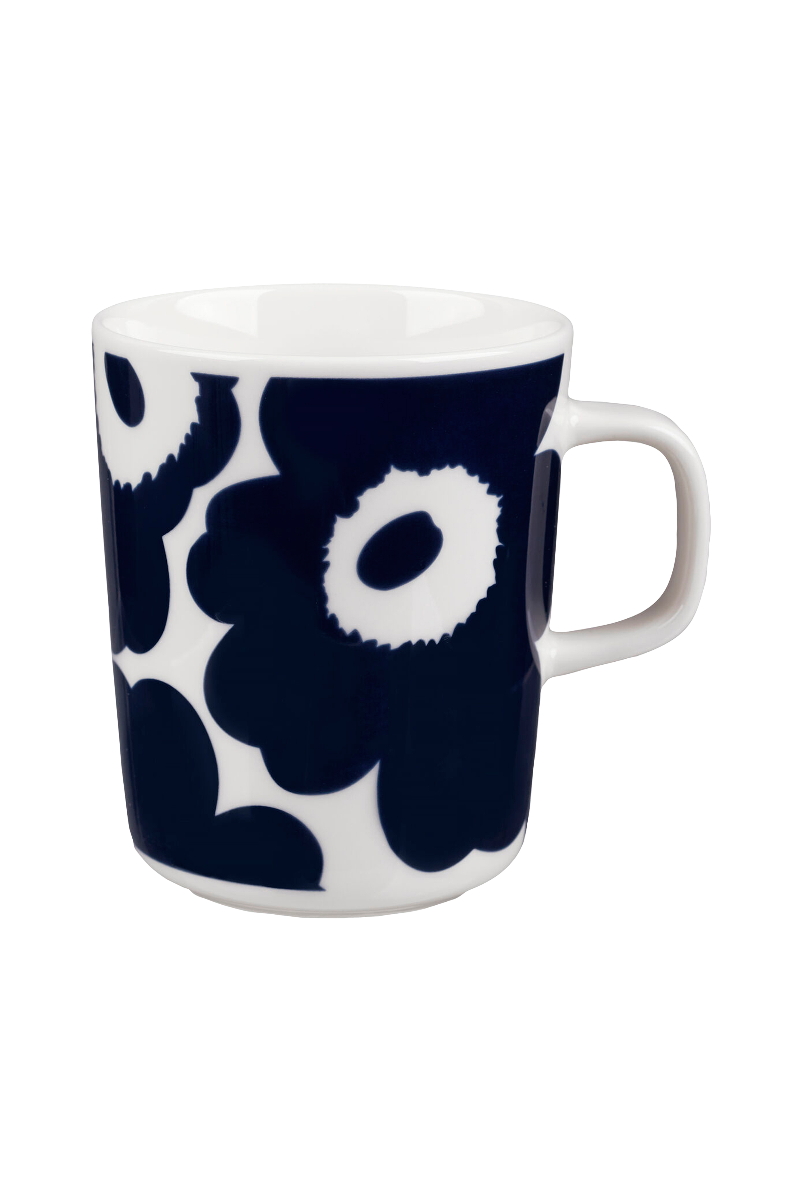 Muki, jossa Unikko-kuvio. Valkoista kivitavaraa, joka kestää konepesun, kuumennuksen uunissa ja mikroaaltouunissa sekä pakastuksen.