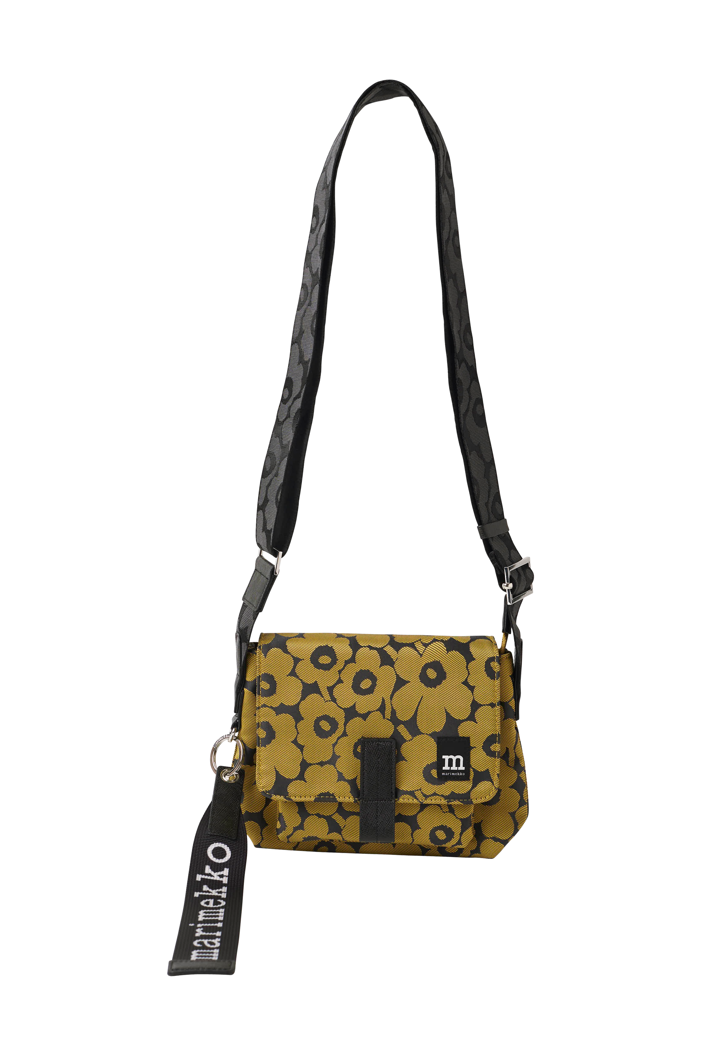 Unikko kuvio Mini Messenger olkalaukku on valmistettu kierrätetystä jacquard-neulotusta polyesteristä. Laukussa on yksi avotasku ja suurempi avolokero etuläpän alla. Säädettävässä olkahihnassa on jacquardneule Unikko -kuvio. Laukussa on Marimekon avaimenperä ja nahkaisia yksityiskohtia. Unikko Luovuutta symboloiva (unikko) syntyi aikana, jolloin Marimekon mallistoissa ei juuri ollut kukkakuvioita. Maija Isola kuitenkin innostui kukkateemasta ja päätti luoda kokonaisen valikoiman uudenlaisia kukkakuvioita.